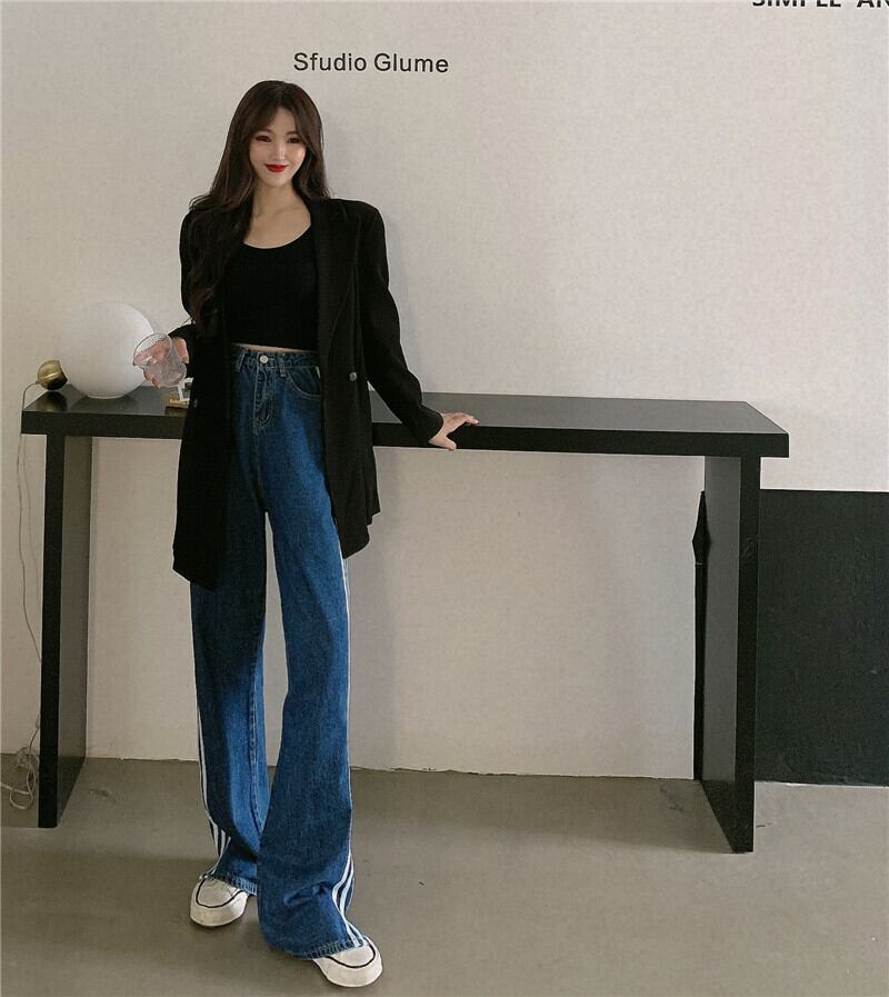 ストライプステッチワイドレッグジーンズレディース秋ハイウエストルーズストレートパンツオールマッチモップパンツインタイド ブラックストロベリース47748898637