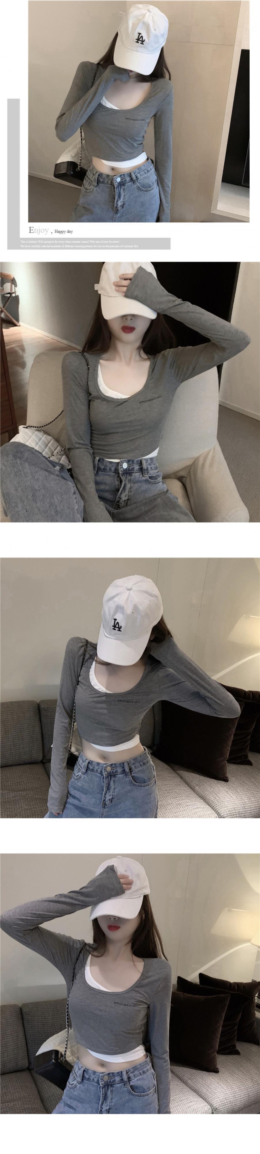 フェイクツーピースブラックTシャツレディース秋の長袖タイトフィットボトミングシャツ2020新デザインショートトップ ブラックストロベリース93519031711