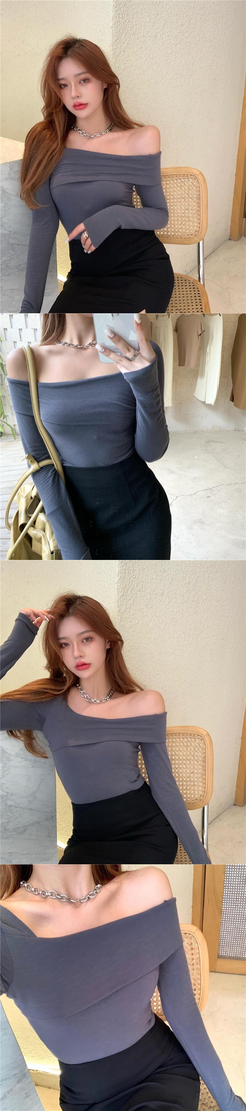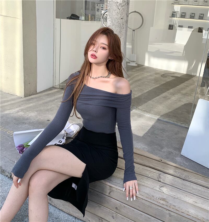センスオフショルダーピンク長袖Tシャツレディース秋のタイトフィットボトミングシャツ2020新しいセクシーなインナートップ ブラックストロベリース44847632881