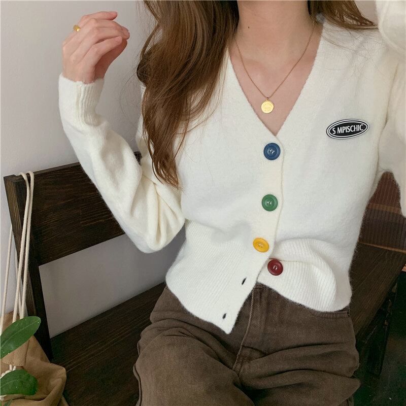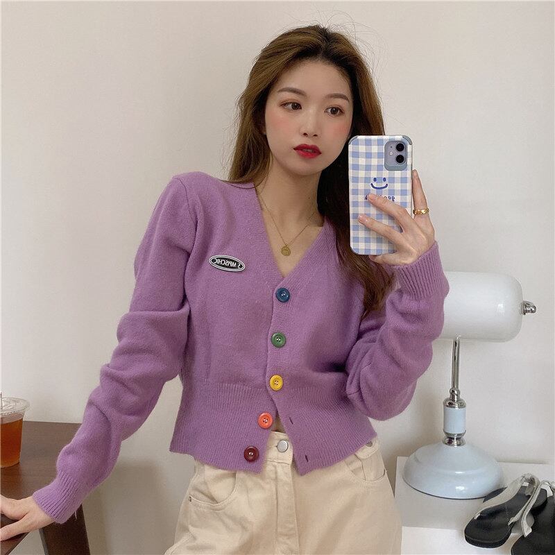 カラーボタンニットスモールカーディガンレディース秋半半袖セータージャケットシックブルースウィートトップ ブラックストロベリース79813781808