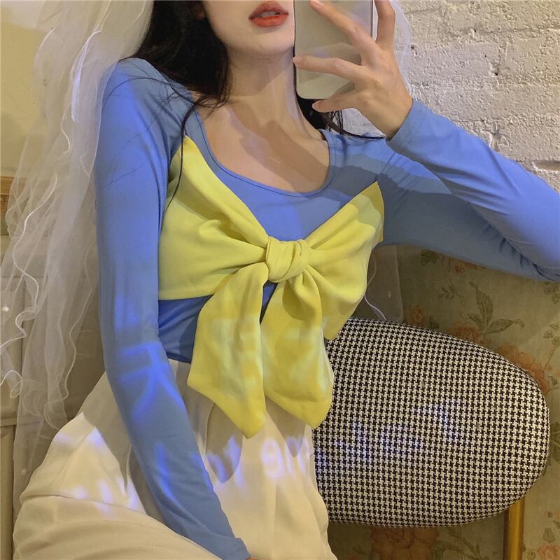 ステッチボウノット長袖Tシャツレディース秋タイトフィットコットンボトミングシャツインデザインセンスのスリムインナートップ ブラックストロベリース30317393106
