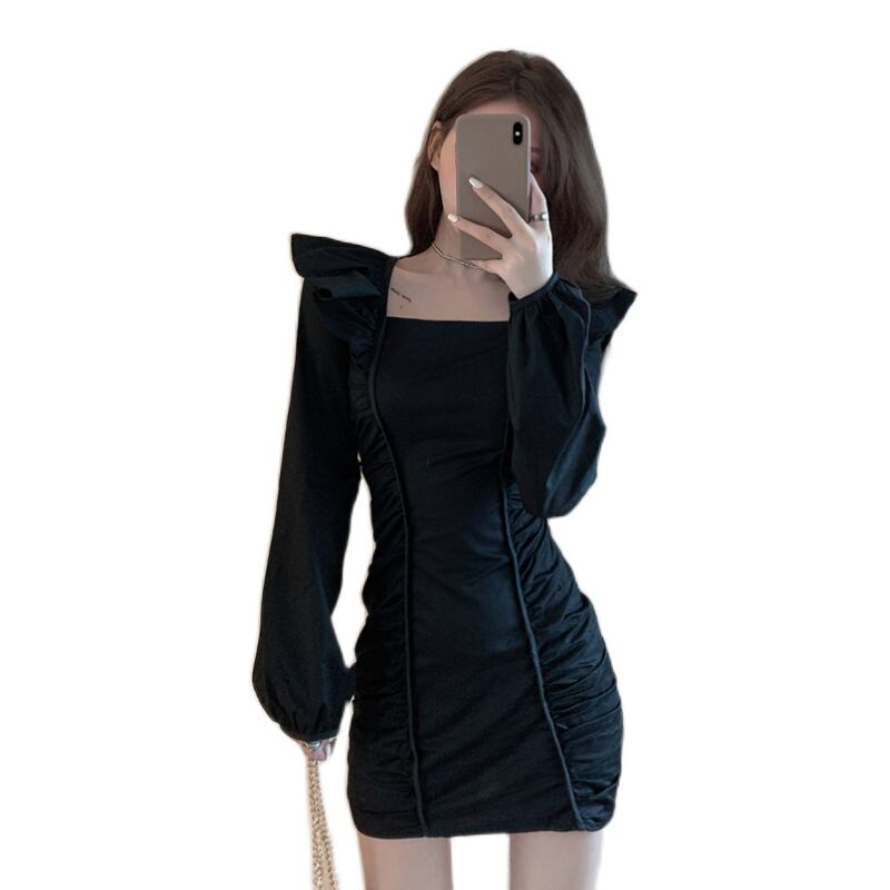 スクエアネック長袖黒ドレスレディース初秋タイトフィットヒップスカート2020新気質ウエストスリムスカート ブラックストロベリース92595924528