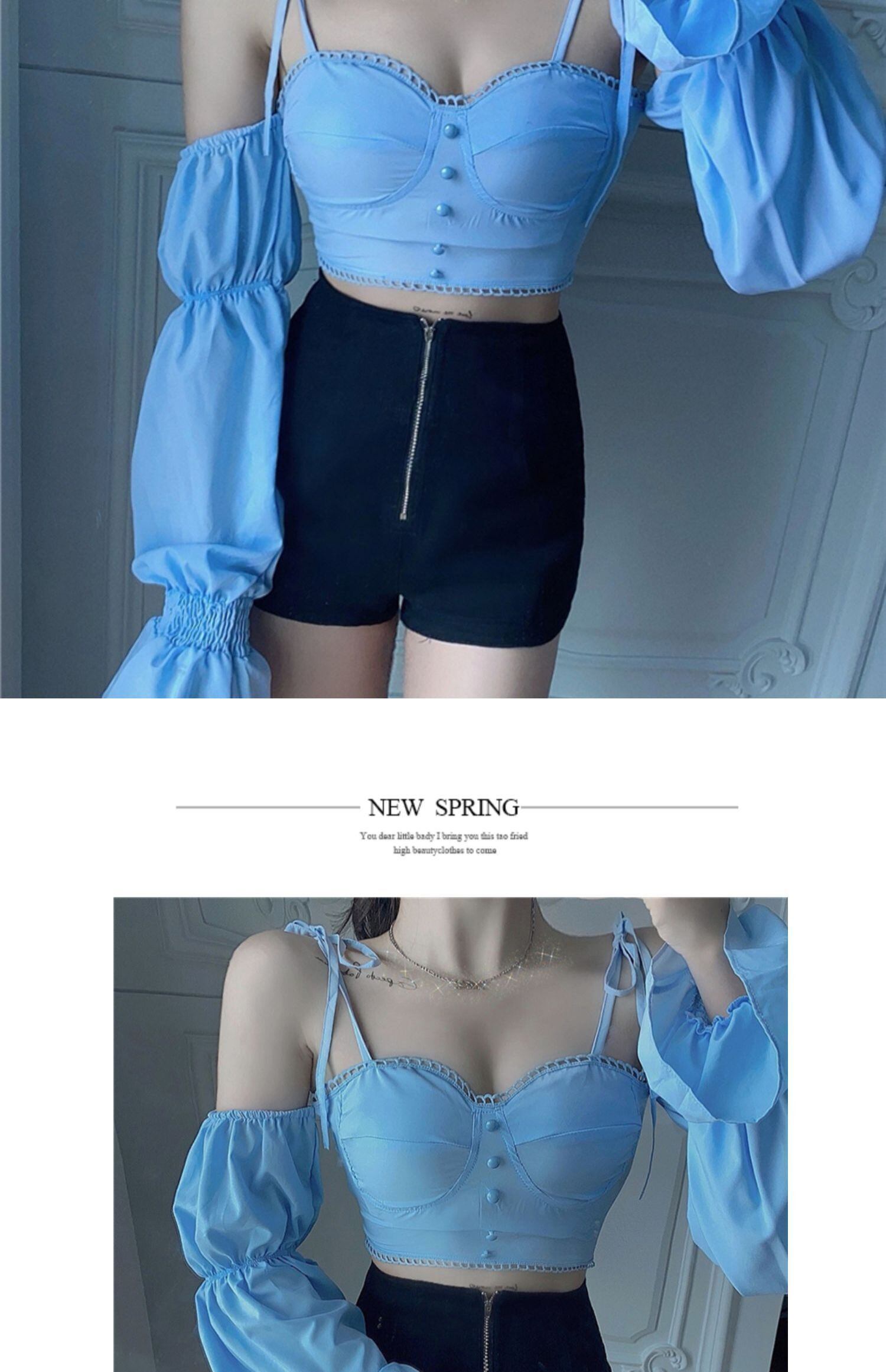 ワンショルダーショートクロップド長袖シャツレディース秋のデザインニッチシャツブルータイトセクシートップ ブラックストロベリース30916404533