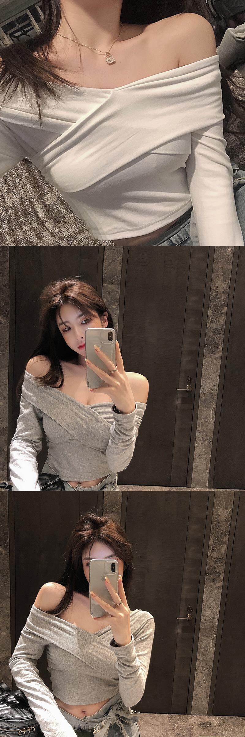 セクシーなオフショルダークロスオーバーホワイトTシャツレディース秋のスリム長袖ボトミングシャツ2020新しいインナーショートトップ ブラックストロベリース28221996642