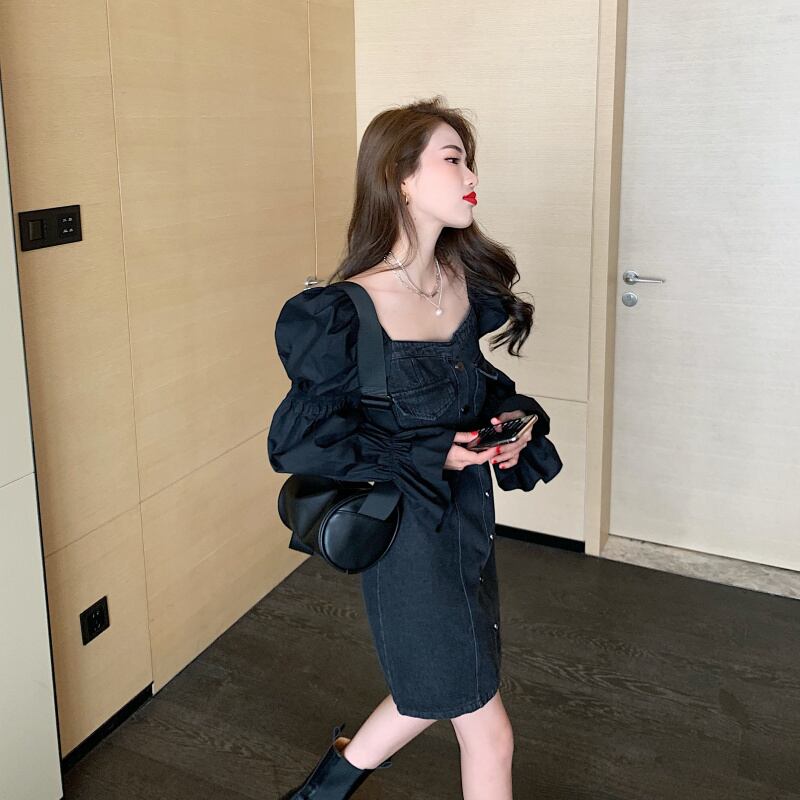 スクエアネックデニムワンピースレディース秋ロングスリーブランタンスリーブAラインショートスカート2020新気性ウエストスカート ブラックストロベリース1838651448