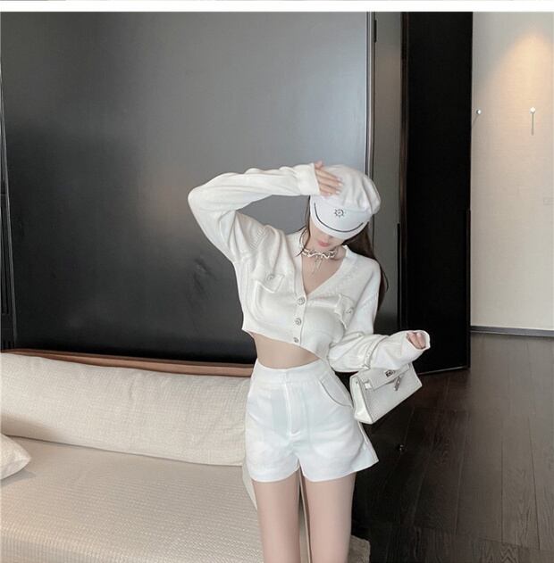 色:白いニットコート,ブラックニットコート,ホワイトショーツ,黒のショートパンツ