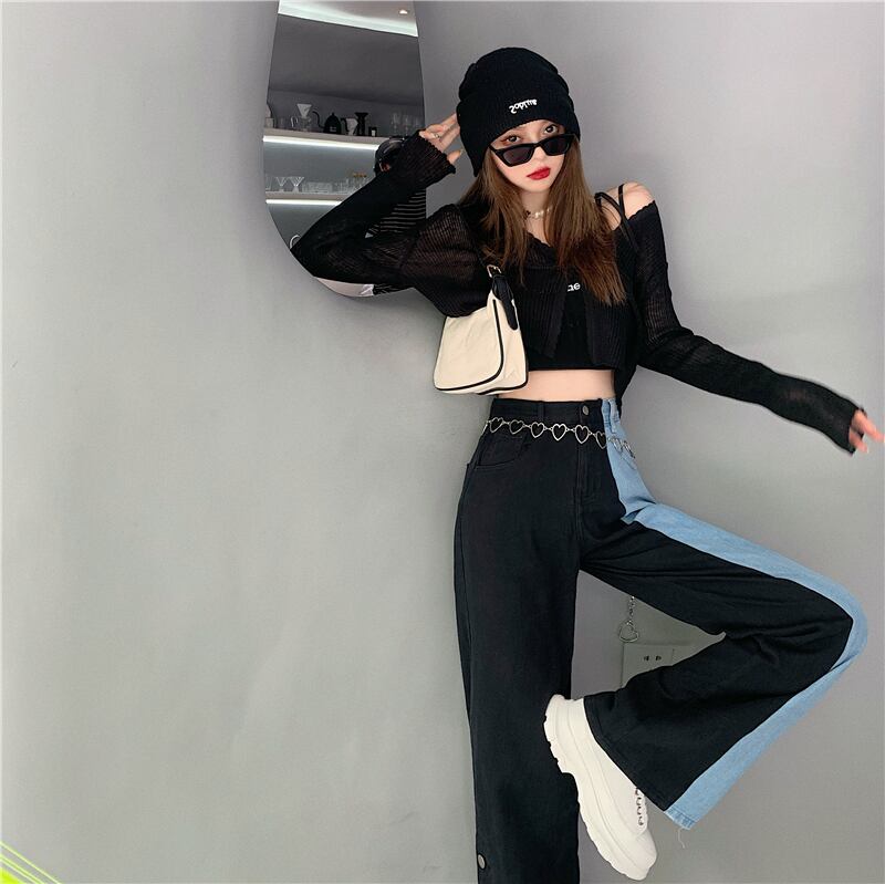 コントラストステッチジーンズレディース秋ルーズカジュアルストレートパンツハイウエストワイドレッグシンパンツインタイド ブラックストロベリース72940196987