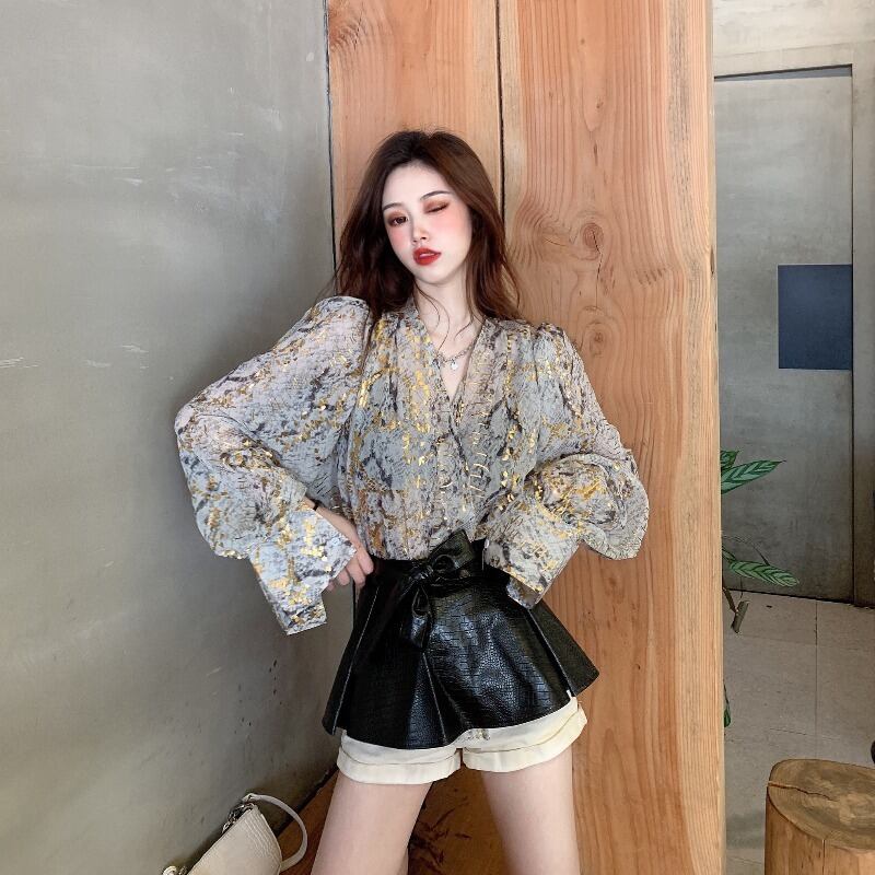 ブロンズスネークプリントシフォンシャツレディース秋ルーズ長袖ランタンスリーブシャツデザインニッチトップ ブラックストロベリース20502468795
