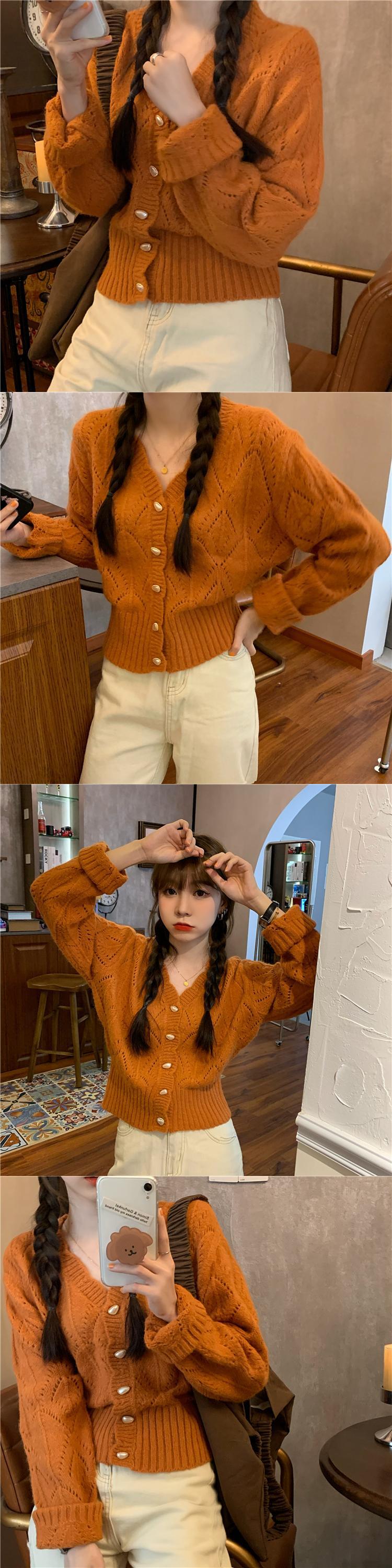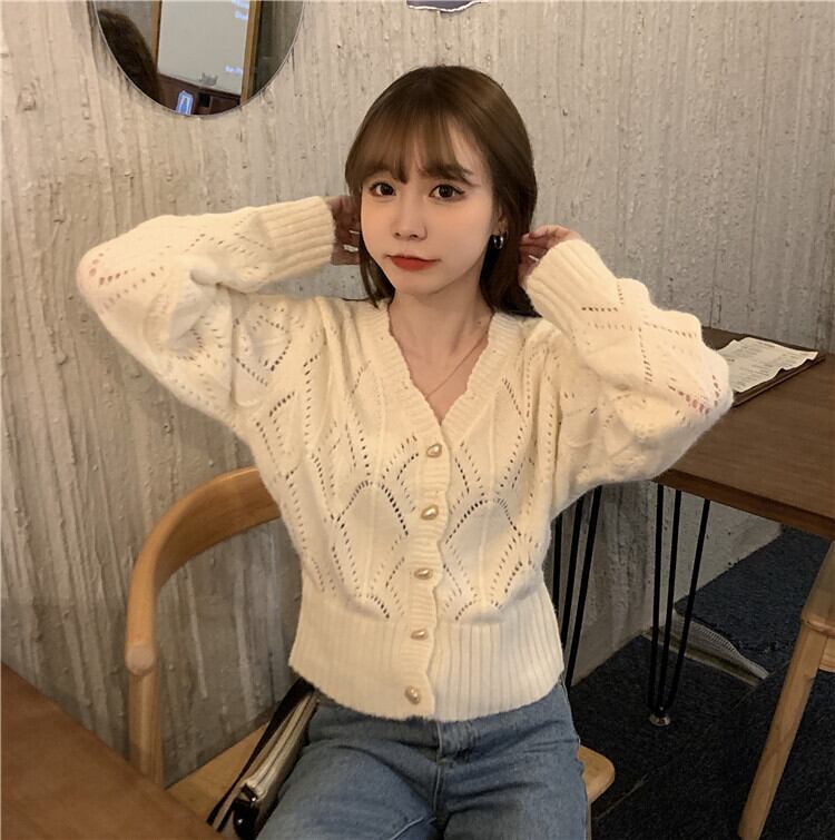 中空ホワイトニットスモールカーディガンレディース秋ルーズレイジースタイル長袖セーターコート薄手ショートトップ ブラックストロベリース36187392802
