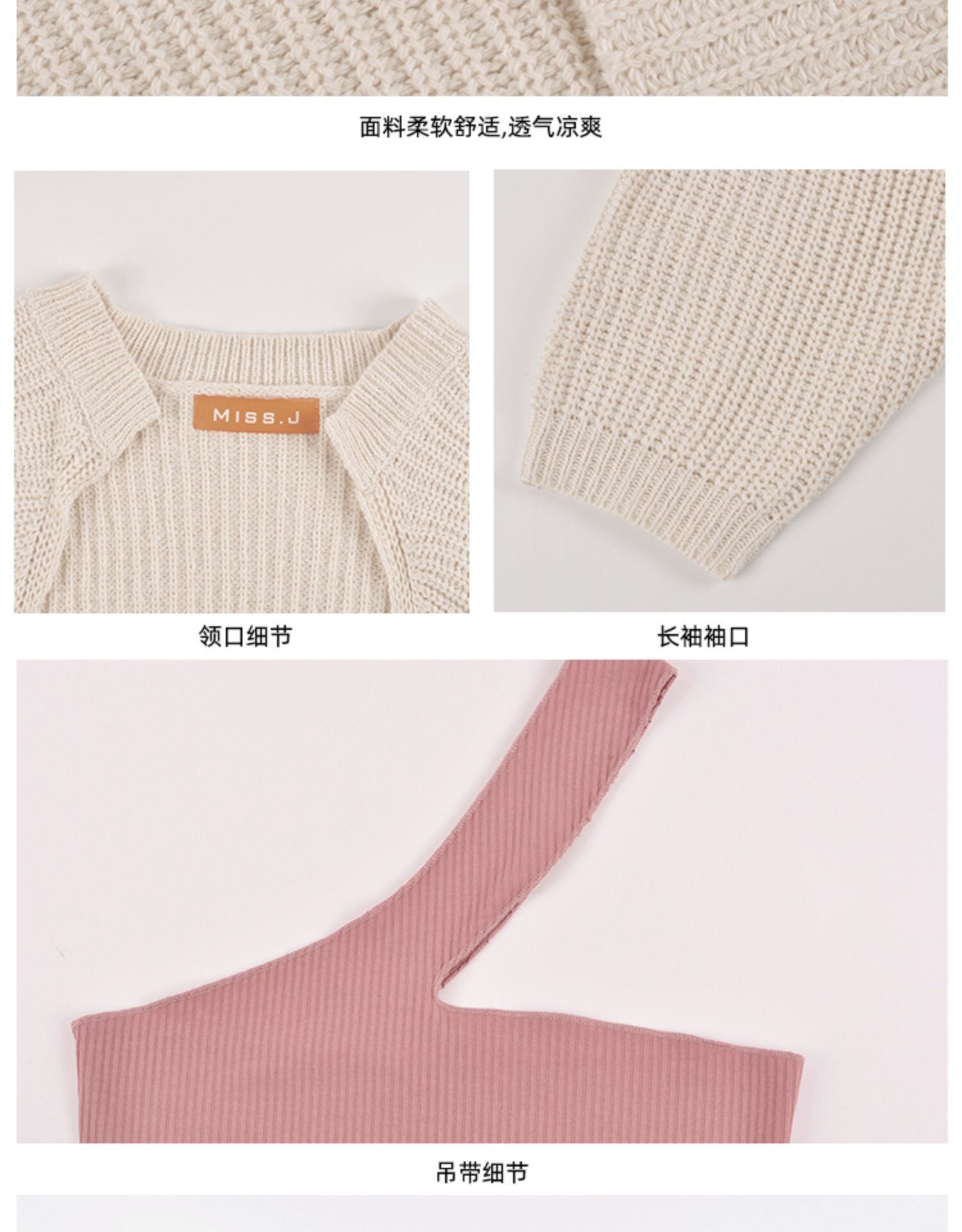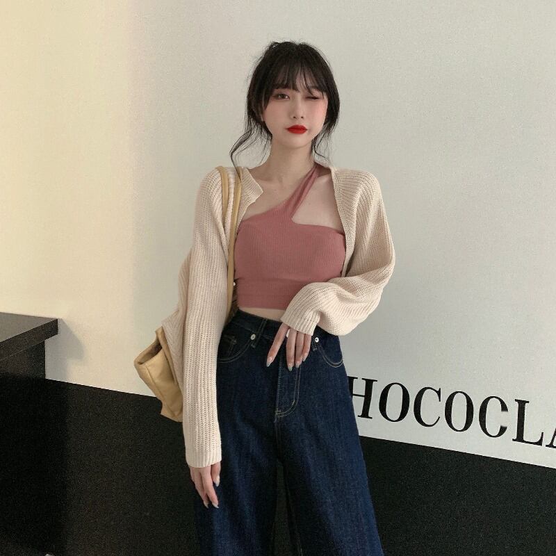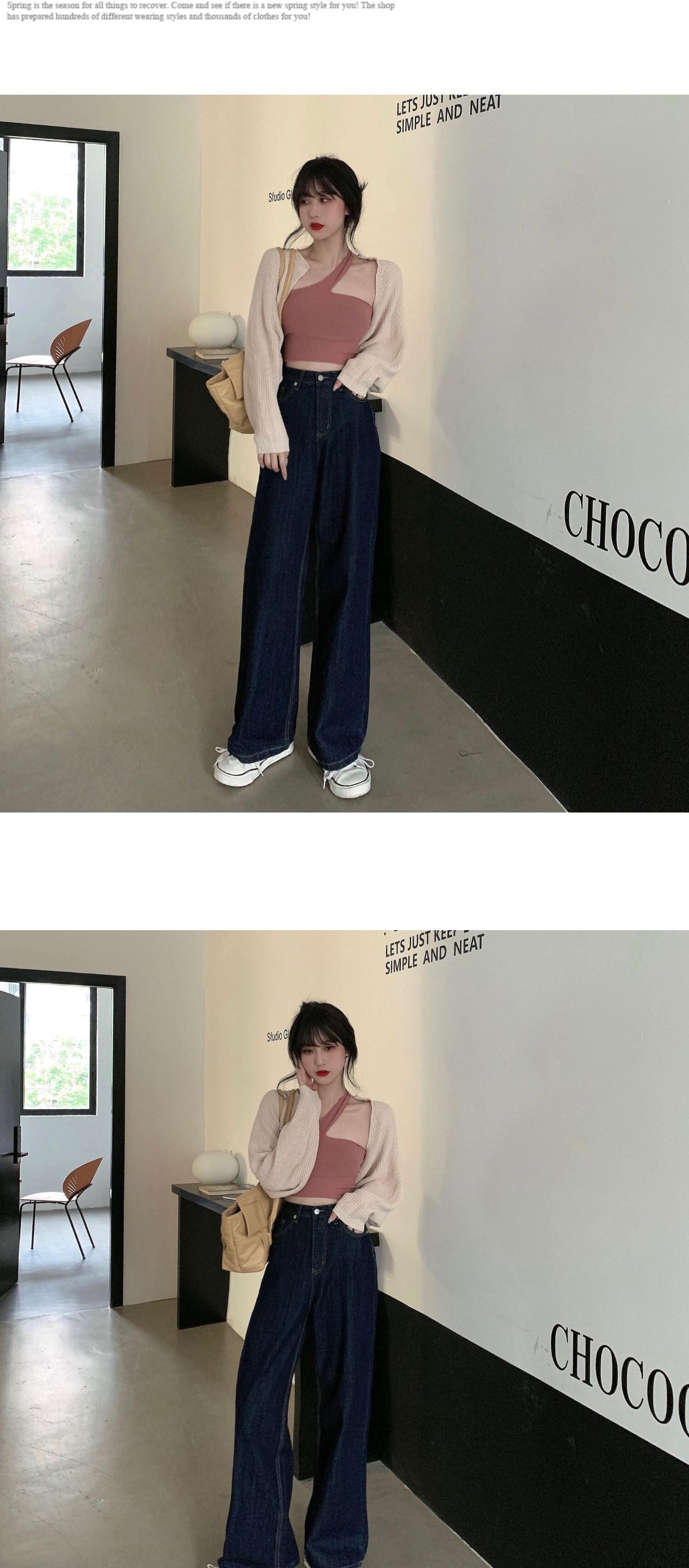色:ピンクのサスペンダー,ベージュカーディガン,ブルージーンズ