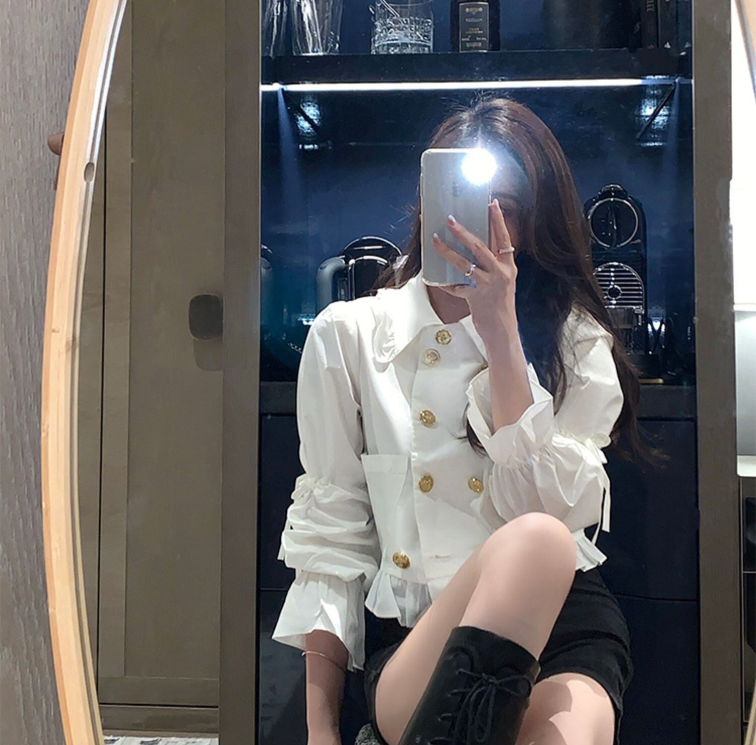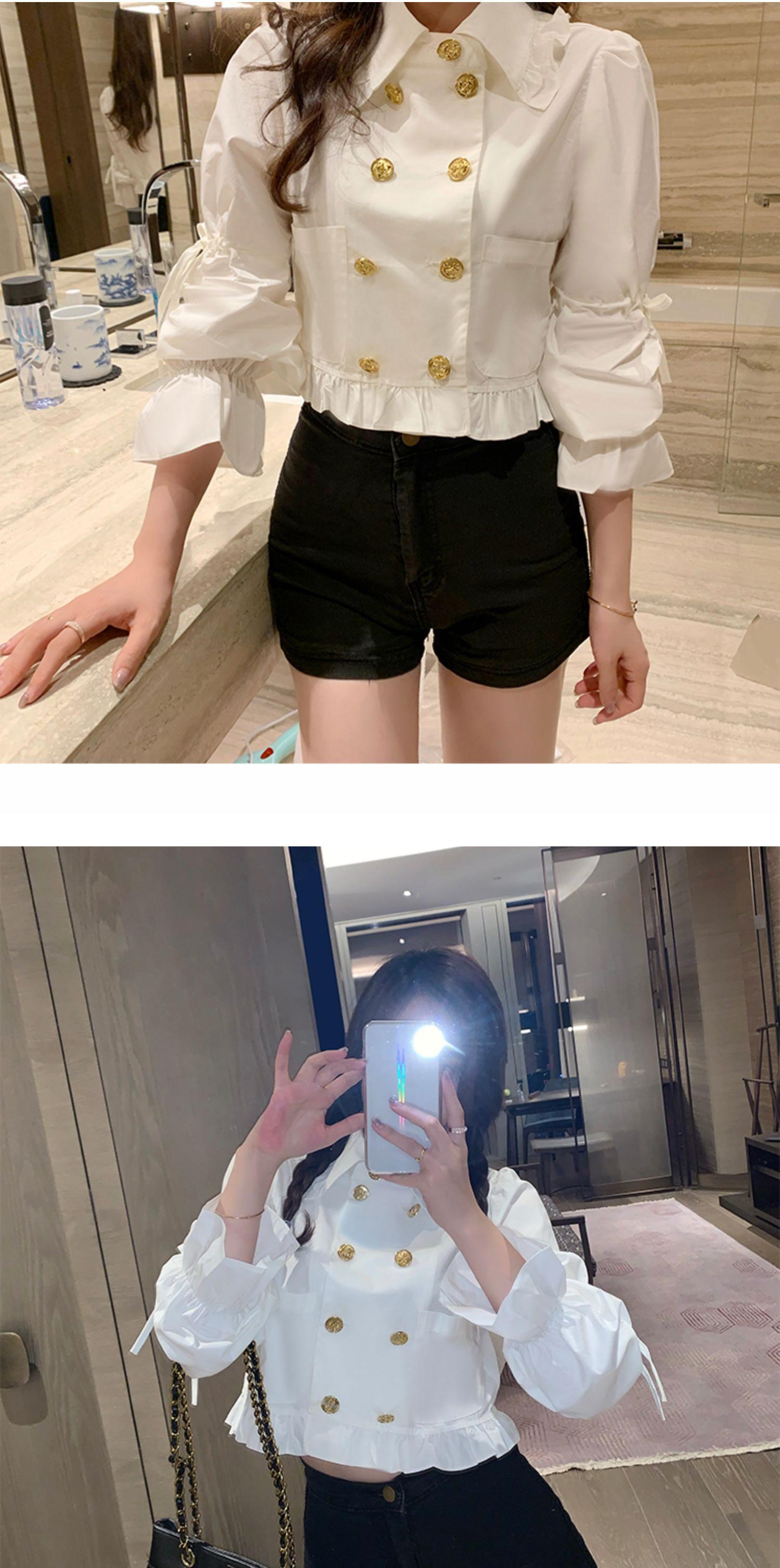 フランスの宮殿スタイルのダブルブレストの白いシャツの女性秋ルーズ長袖シャツデザインニッチショートトップ ブラックストロベリース89351199177