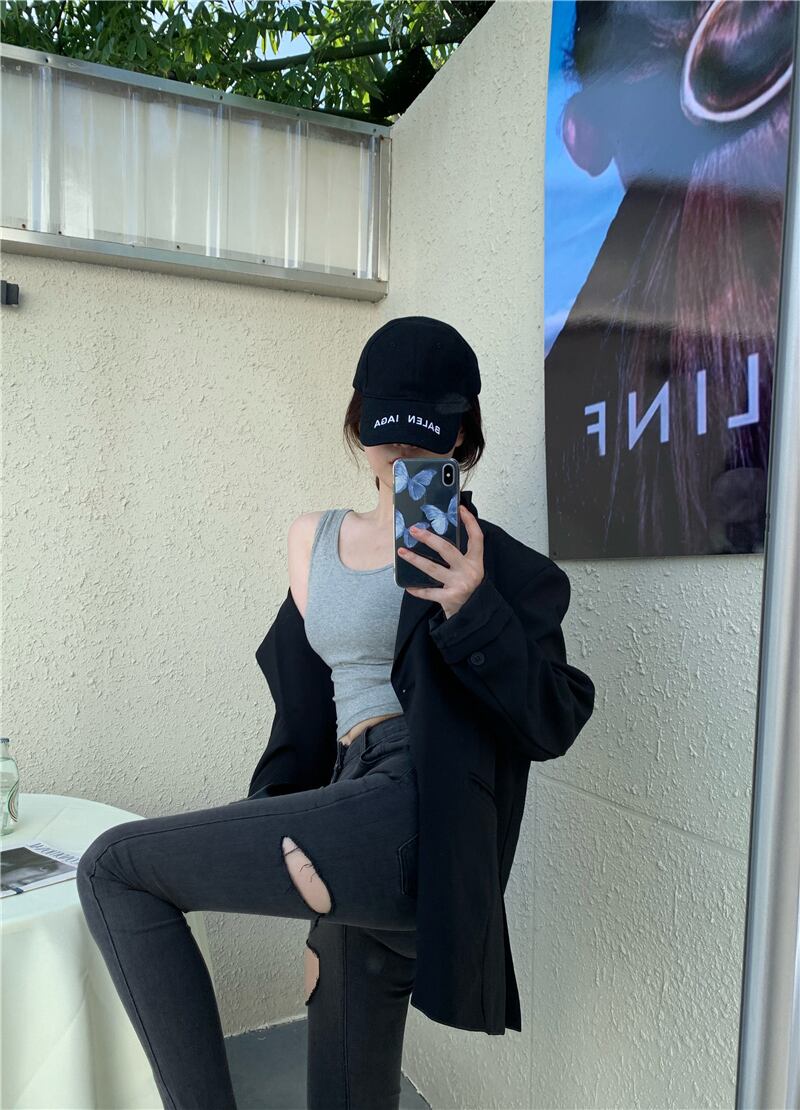 グレーの破れたデニムペンシルパンツレディース春秋ハイウエストストレートパンツ2020新しいタイトフィットスリムレッグパンツ ブラックストロベリース10276071097