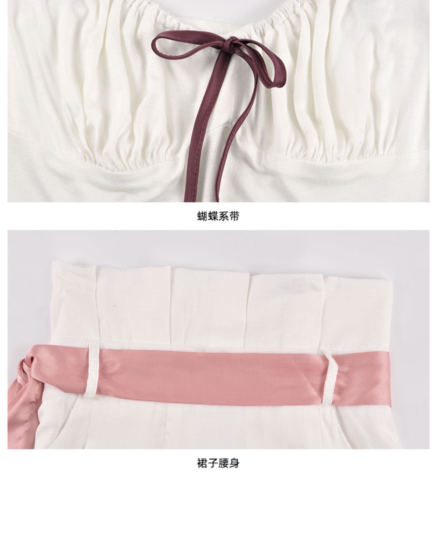 色:ブルーカーディガン,ホワイトサスペンダー,白いスカート