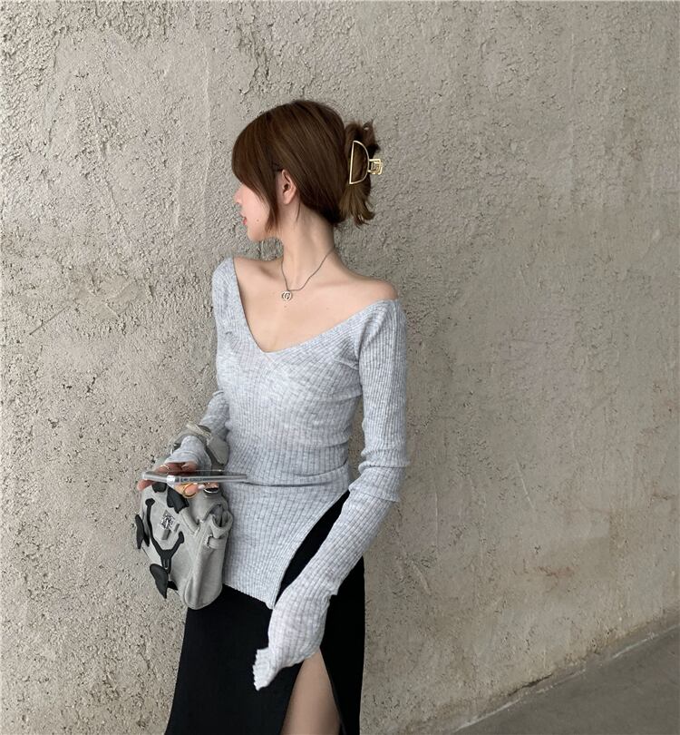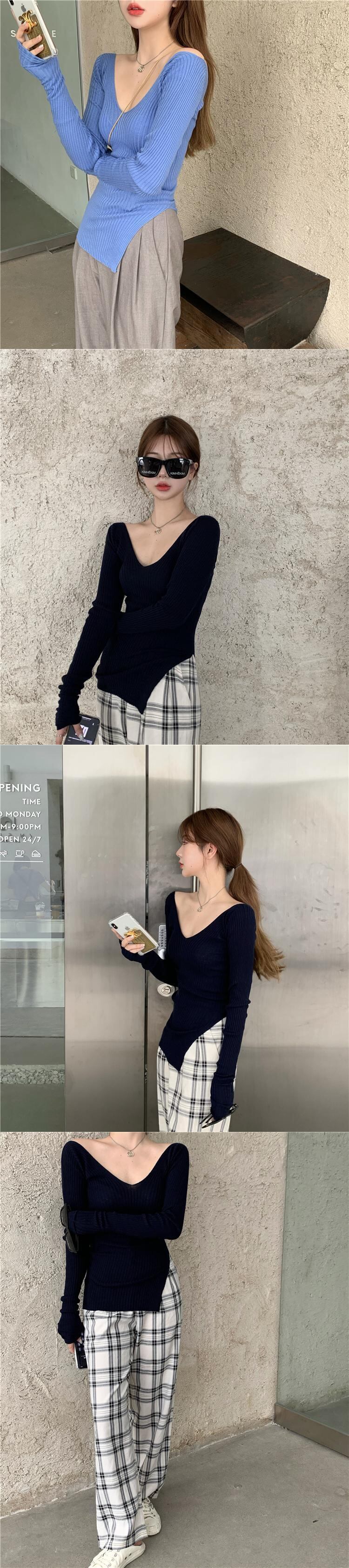 ブルーのVネックニットセーターボトミングシャツ女性の2020年秋新しいスリム長袖薄プルオーバートップ ブラックストロベリース37883426968