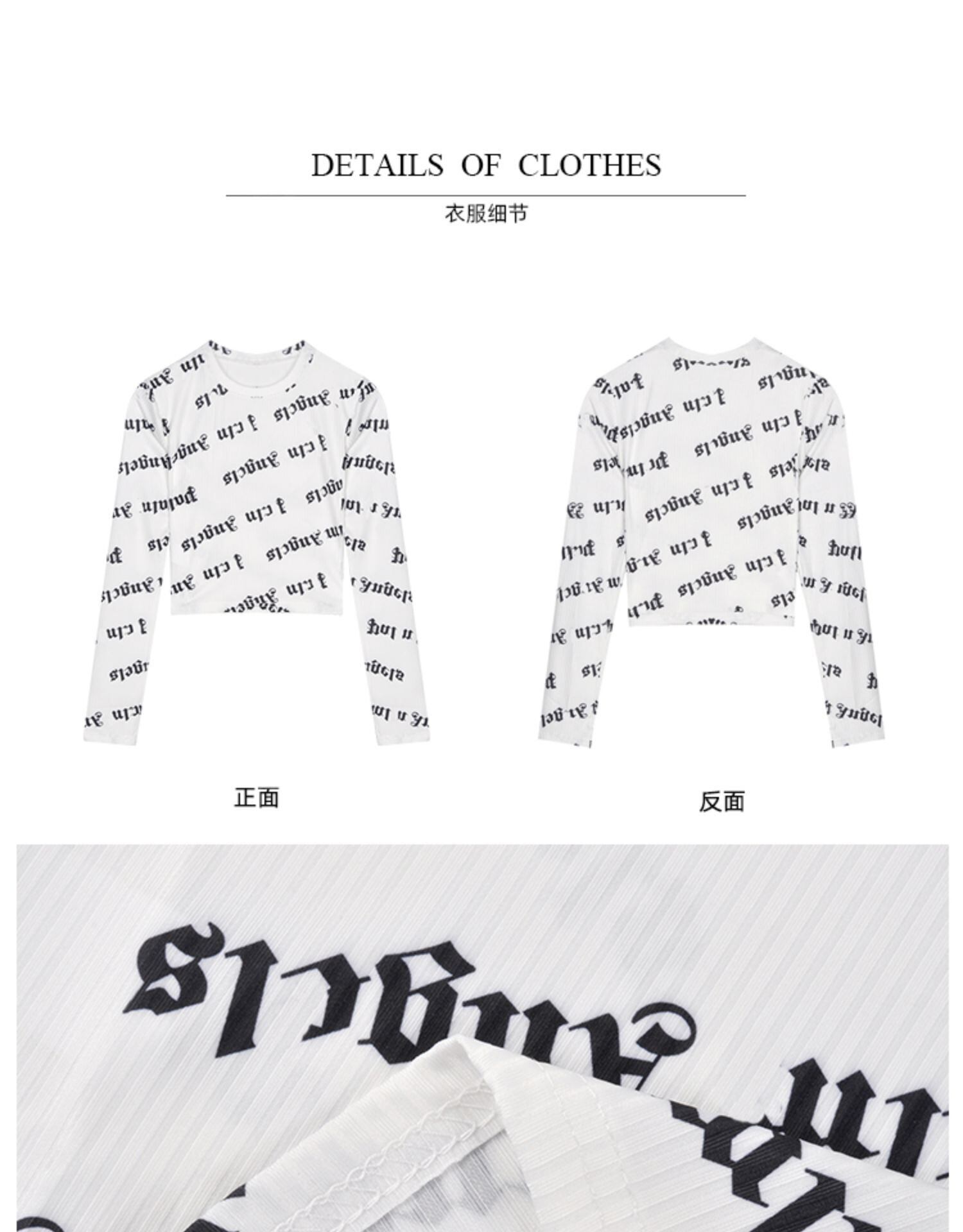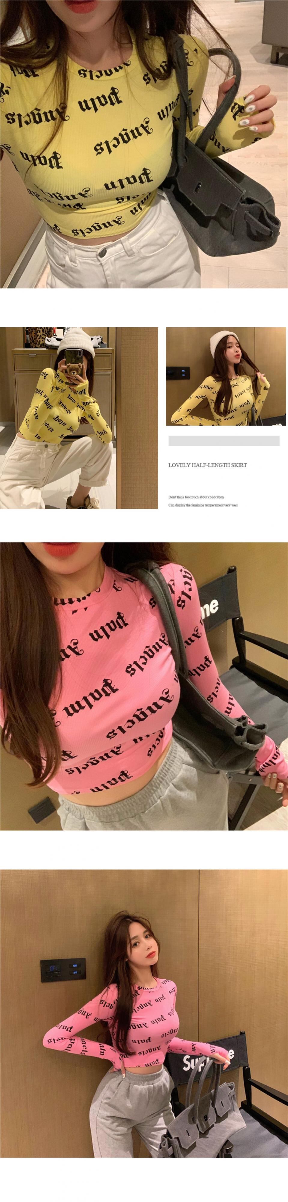 レタープリント白Tシャツ女性秋タイトフィットスリムスリミング長袖ボトミングシャツショートパラグラフトップイン潮 ブラックストロベリース7527856064