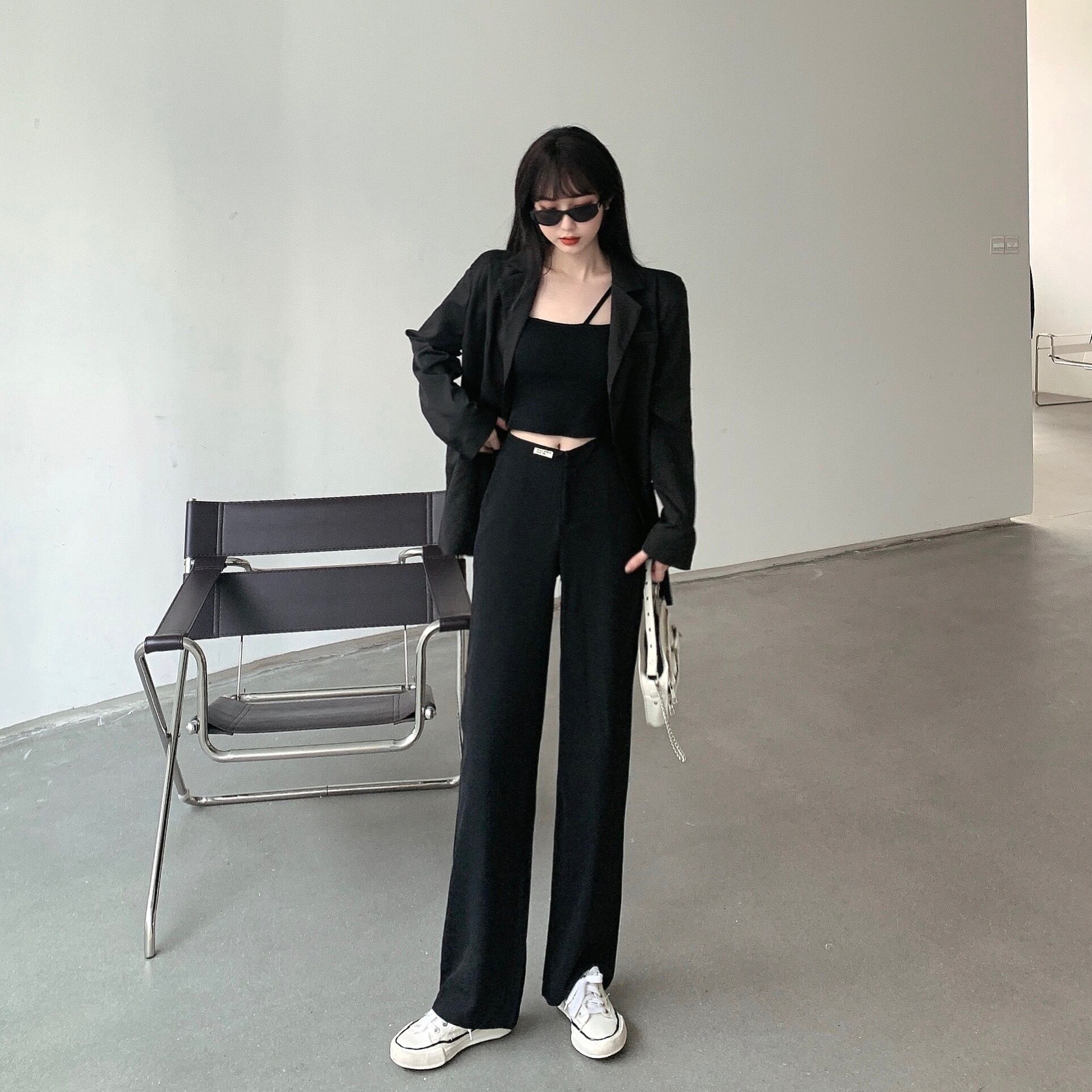 ウエストストレートブラックカジュアルスーツパンツレディース秋ルーズワイドレッグモップドレープパンツ2020ニューパンツ ブラックストロベリース81951549810