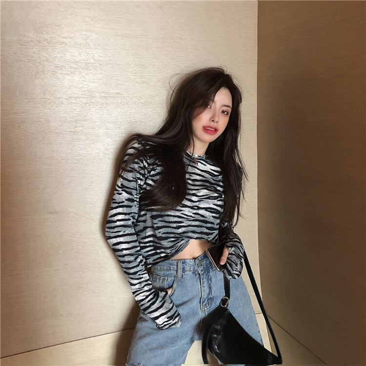 ウエストショートスリム長袖ゼブラ柄インナーボトミングシャツトップレディース2020秋新作タイトTシャツ ブラックストロベリース13332469516