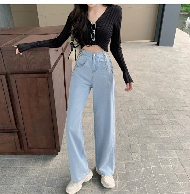 ウエストチェーンジーンズレディース秋ワイドレッグルーズストレートパンツタイド2020ニューデザインセンス薄パンツ ブラックストロベリース56421918208
