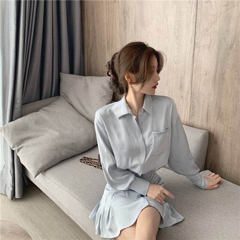 フレンチブルー長袖シャツドレス女性の2020年秋新しいサテンショートスカート気質薄いスカート ブラックストロベリース18772729692