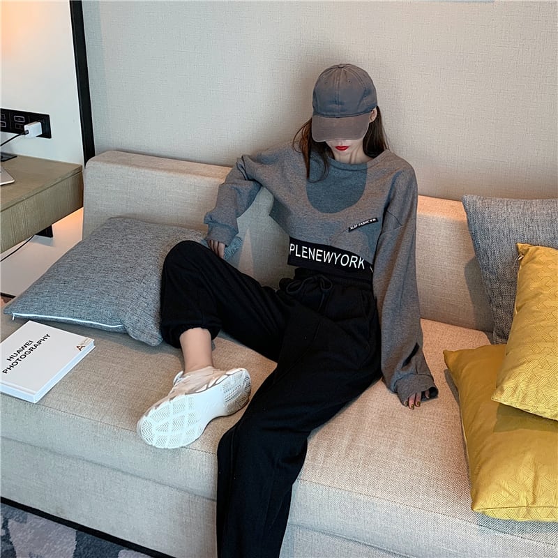 スタックドフェイクツーピースプリントグレーセーター女性秋ルーズ長袖プルオーバージャケット2020新しいクロップドトップ ブラックストロベリース47396236284
