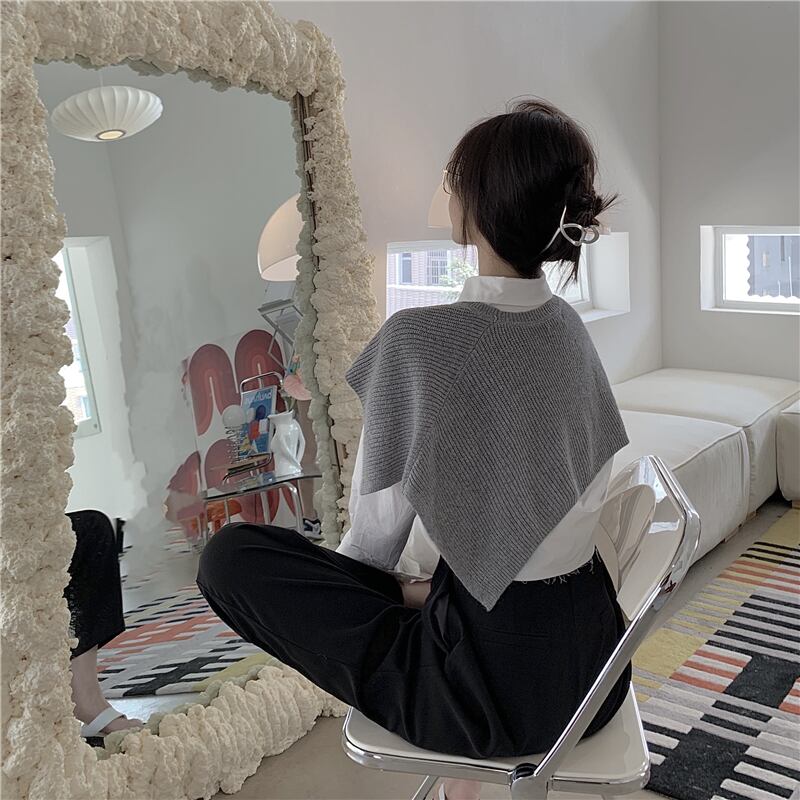 色:グレーショール,白のシャツ,黒いズボン