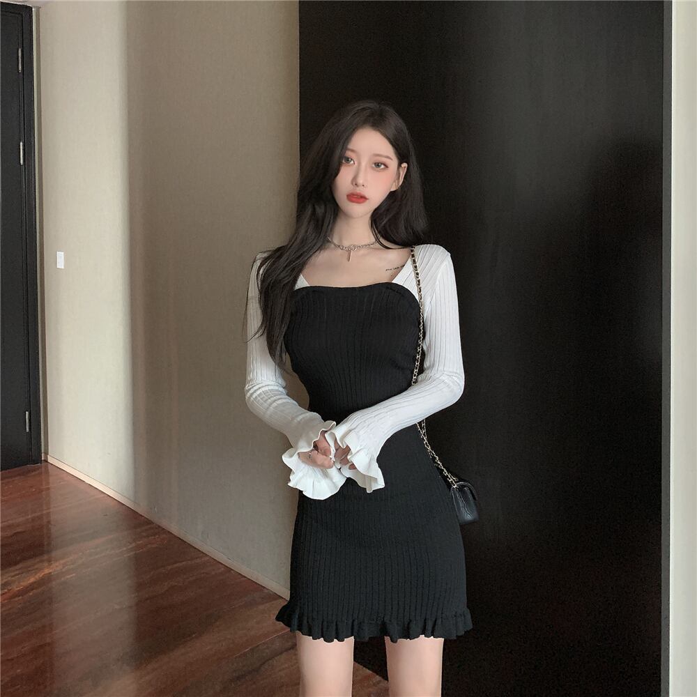 偽のツーピースフリル長袖フィッシュテールニットドレス女性2020年秋新しいショートスカート黒タイトスカート ブラックストロベリース98599296327