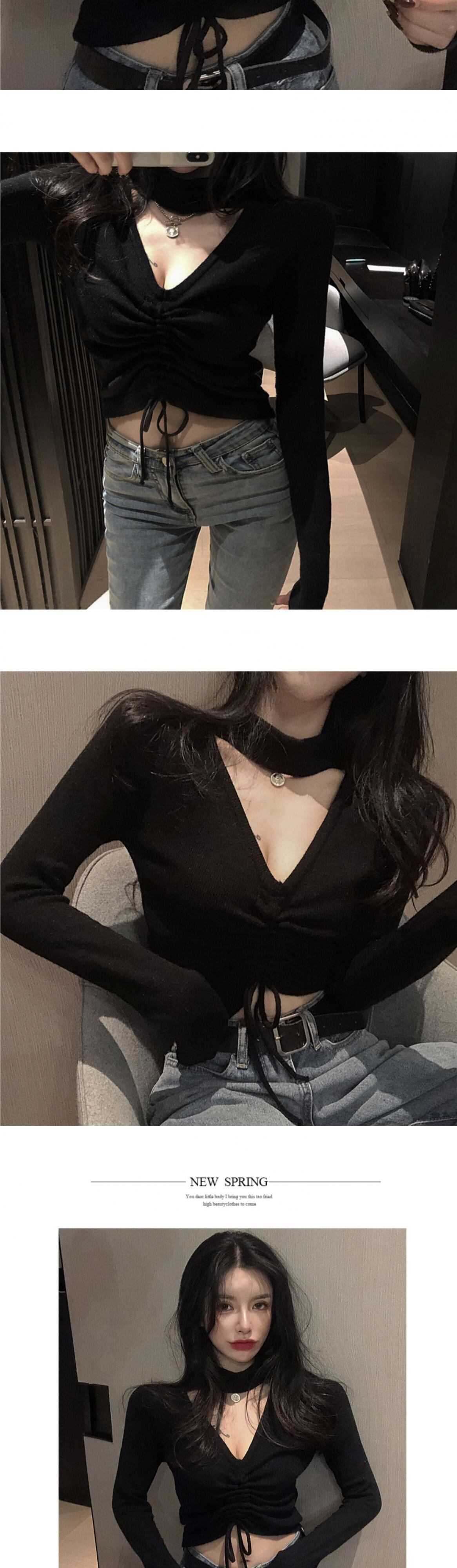 Vネックブルーセーターレディース秋新作スタイルタイトフィット中空プルオーバーセーターボトミングシャツ長袖ショートトップ ブラックストロベリース31908258768