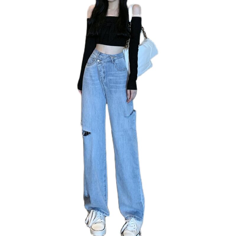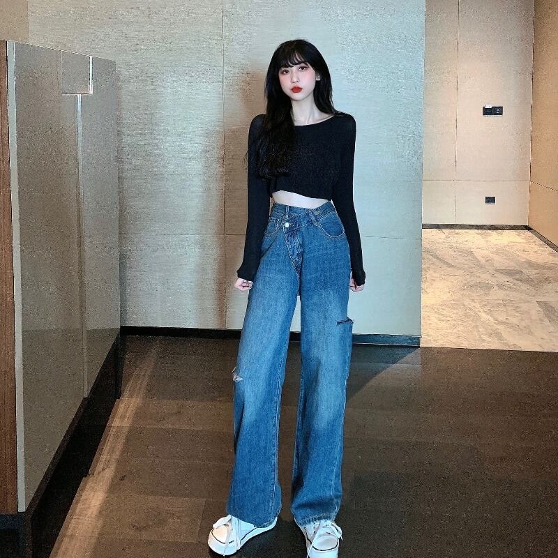生エッジのブルーハイウエストストレートレッグジーンズレディース秋スリールーズワイドレッグパンツモップドレープパンツ ブラックストロベリース31310750464