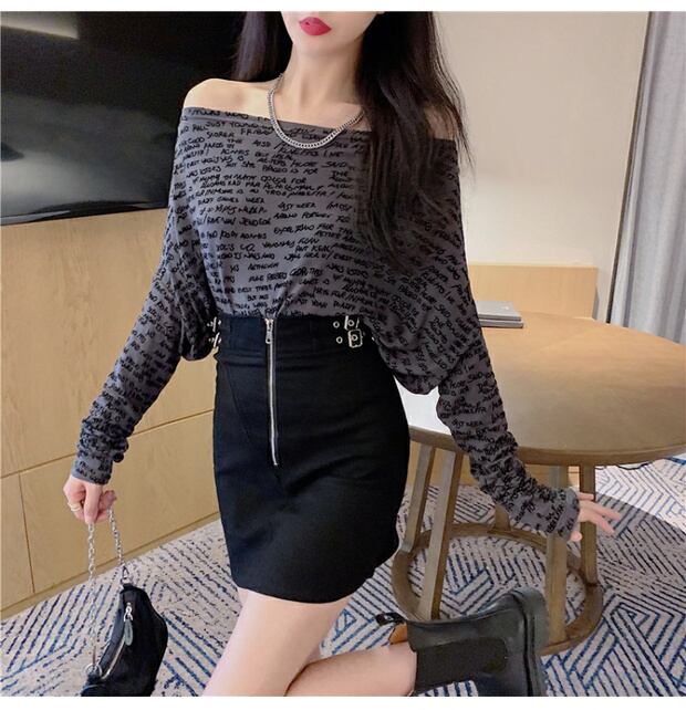 ワンショルダープリント怠惰なルーズ長袖Tシャツレディース秋のinsボトミングシャツバージョンinstideグレートップ ブラックストロベリース96962435466