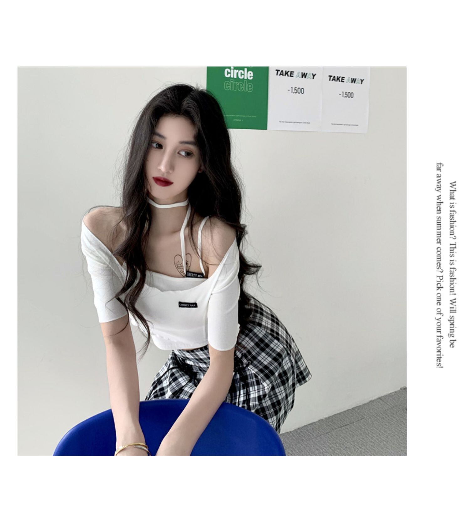 小さな白いスリングを折りたたんで、下にノースリーブのキャミソールが付いた女性用サマーホルターネックとショートトップ ブラックストロベリース71392832935