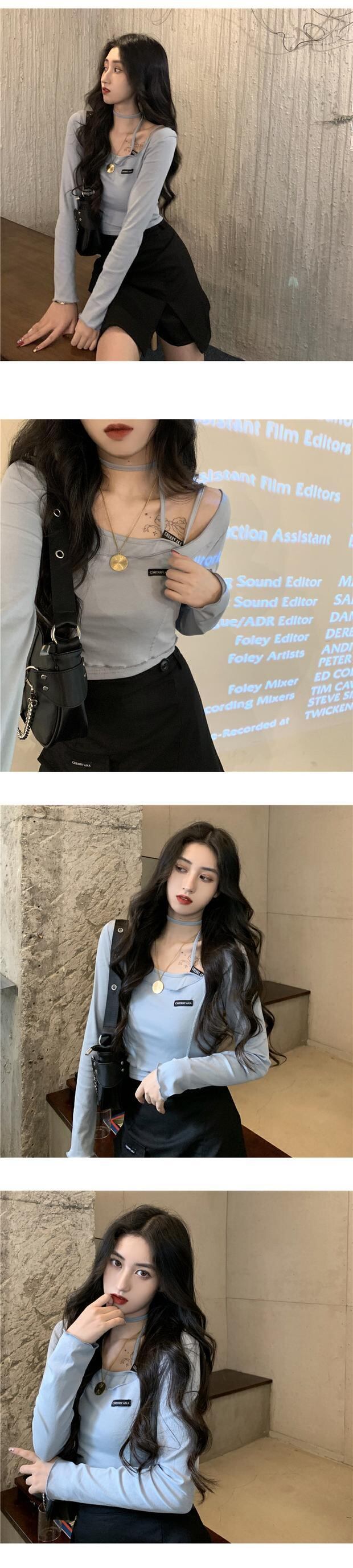 ブラックスクエアネック木製イヤーTシャツレディース秋の長袖ボトミングシャツ2020新しいインナーショートトップイントレンド ブラックストロベリース66680395973