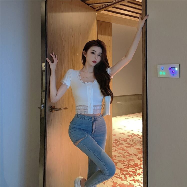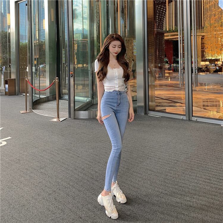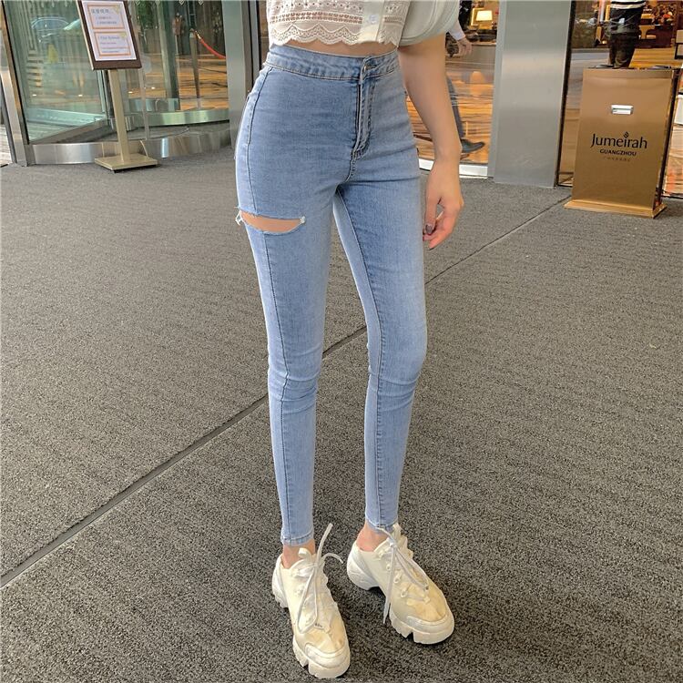 女性の秋のハイウエストオールマッチパンツに穴の開いたタイトフィットストレッチブルーペンシルジーンズ、細い足の9ポイントパンツ ブラックストロベリース70561309375
