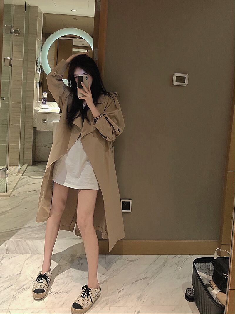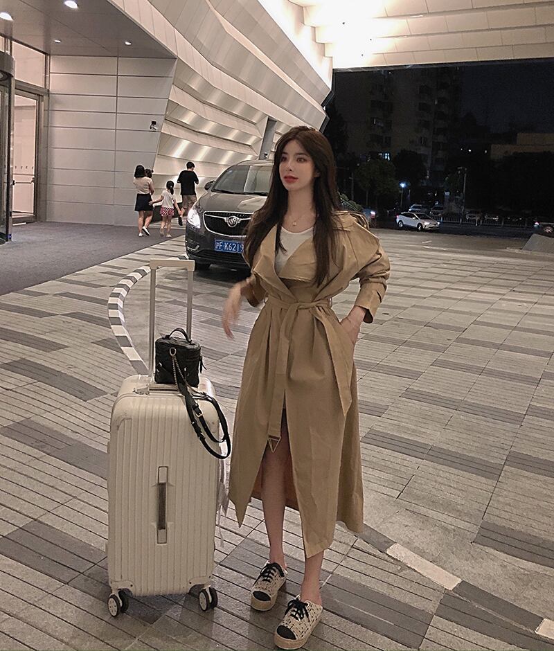 ミッドレングスのブリティッシュスタイルのレースアップウエストトレンチコートジャケットレディース2020年秋新しいルーズオーバーザニーカーキコート ブラックストロベリース70941841809