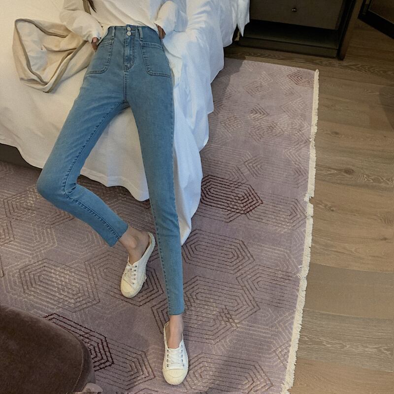 ウェストスキニージーンズ オータム薄手ストレッチパンツ ハイウェスト エラスティック 伸縮 秋物 ヨーロピアン ブラックストロベリース16599758822