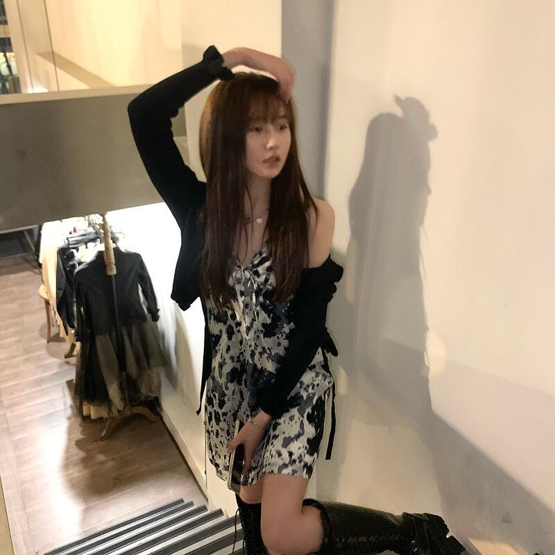 ボウ絞り染めインナーストラップドレス女性2020年秋新作ショートスカートデザインセンスニッチウエストスカート ブラックストロベリース83810965824