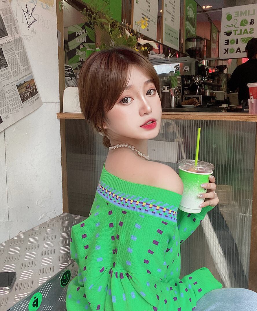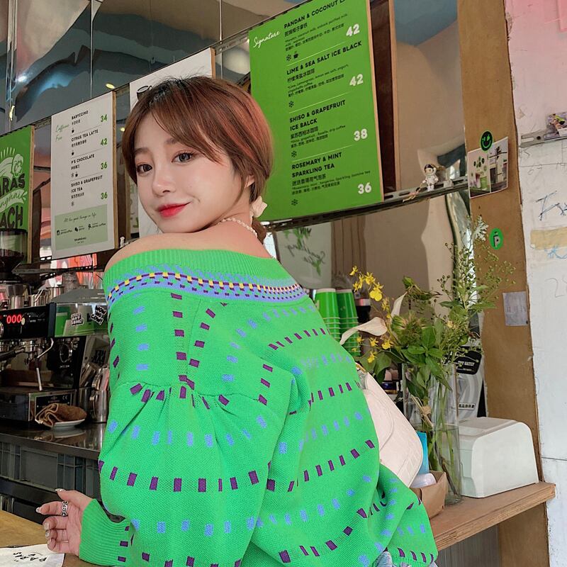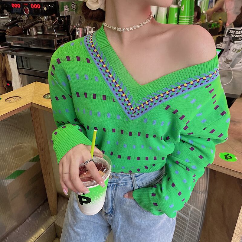 プリントVネックグリーンニットセーターボトミングシャツレディース2020年秋新作ルーズレイジースタイルトップス ブラックストロベリース89022500131