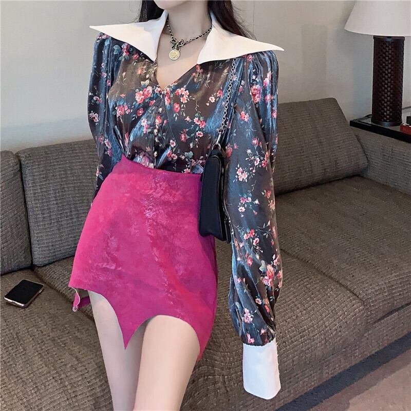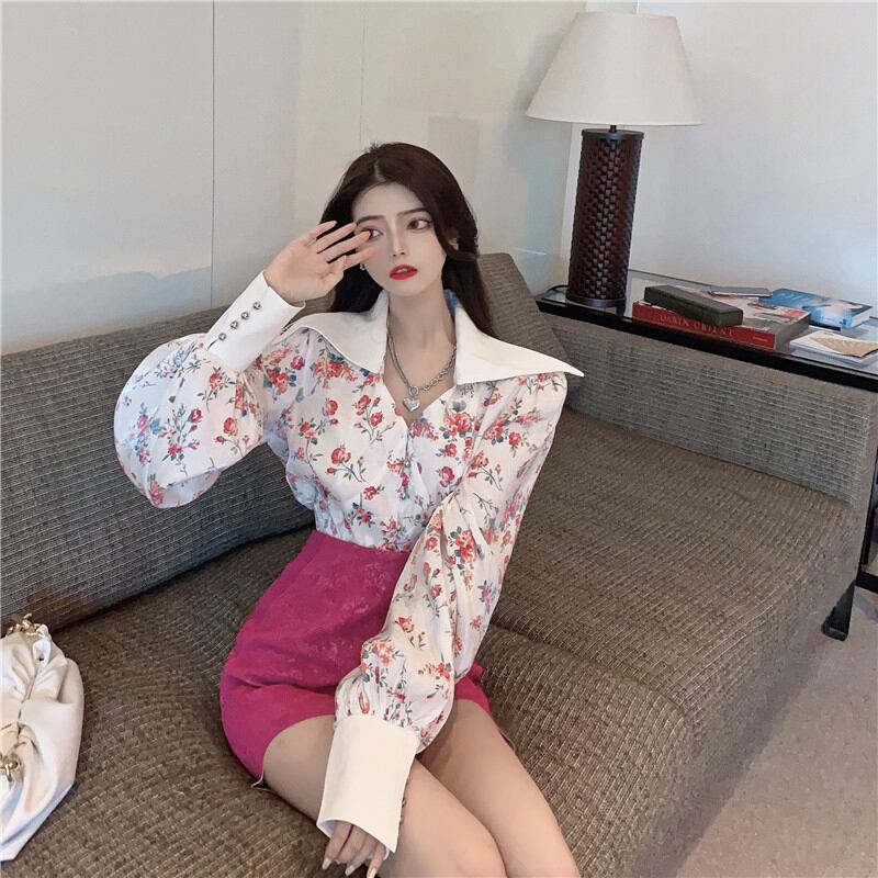 小さな花柄のVネックシャツの女性秋長袖ランタンスリーブシャツジャケットデザインセンスニッチショートアウタージャケット ブラックストロベリース54988706688