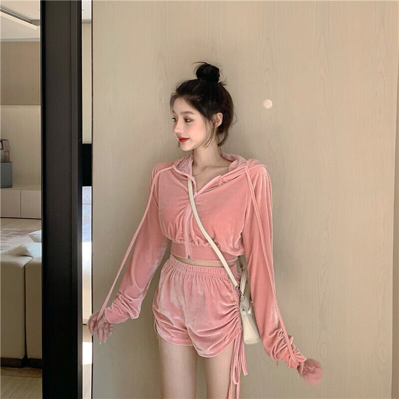 ピンクのベルベットフード付きセーター女性の2020年秋新しいスタイルのルーズ長袖カーディガンショートシンコートトップ ブラックストロベリース54419738439