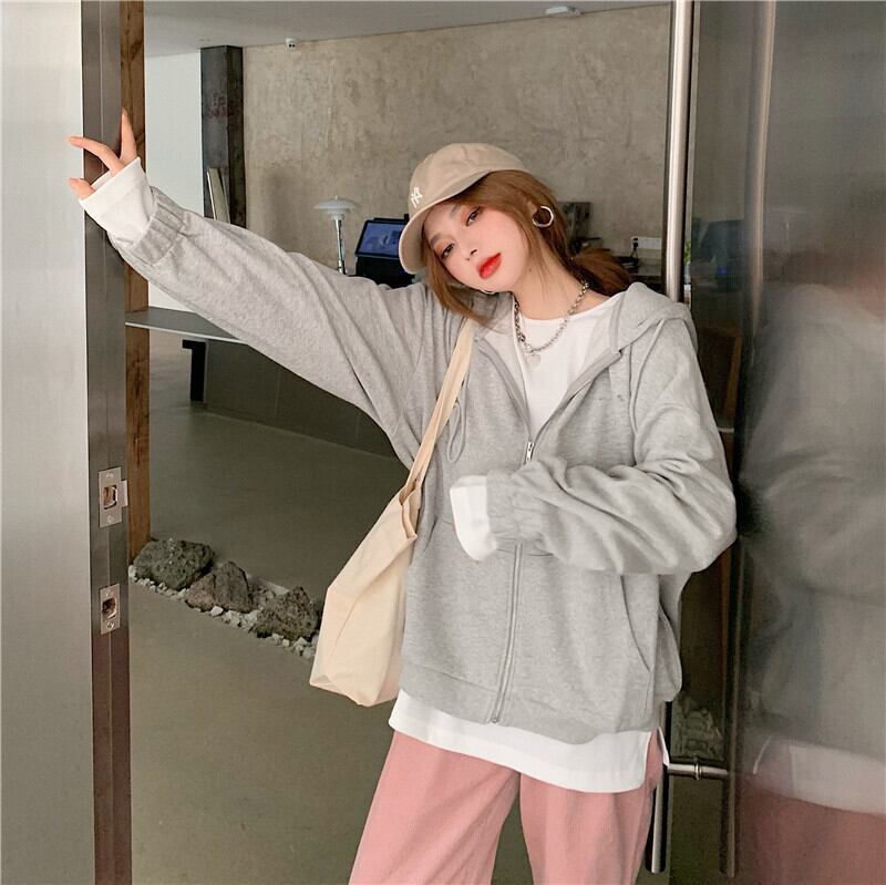 ジッパーグレーのフード付きセーター女性秋ルーズ長袖カーディガンジャケット2020新しいトップインタイド ブラックストロベリース96707370138