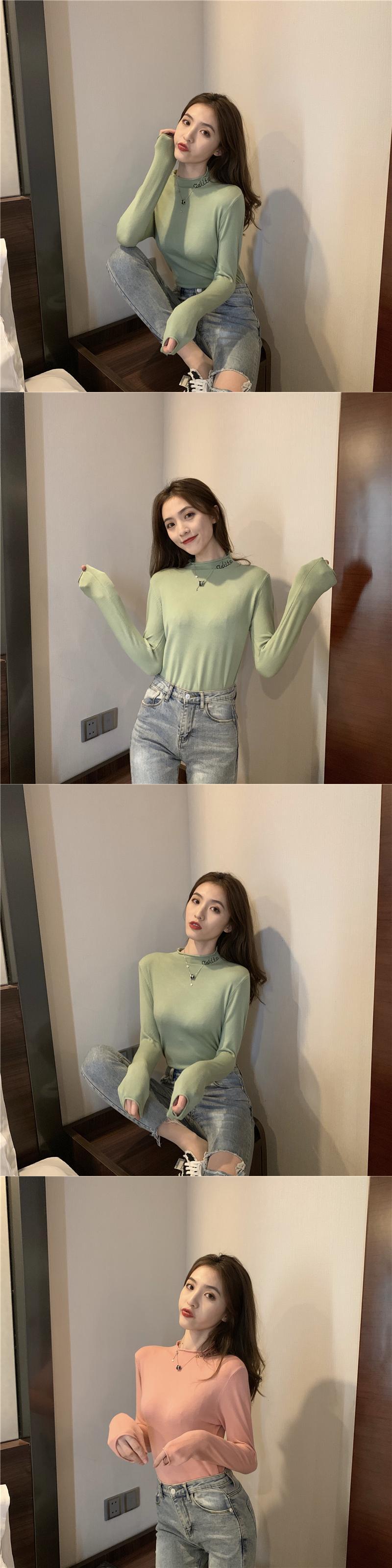 ハーフハイカラー刺繍タイトフィット長袖インナーボトミングシャツトップレディース2020秋新作オールマッチグレーセーター ブラックストロベリース11719768488