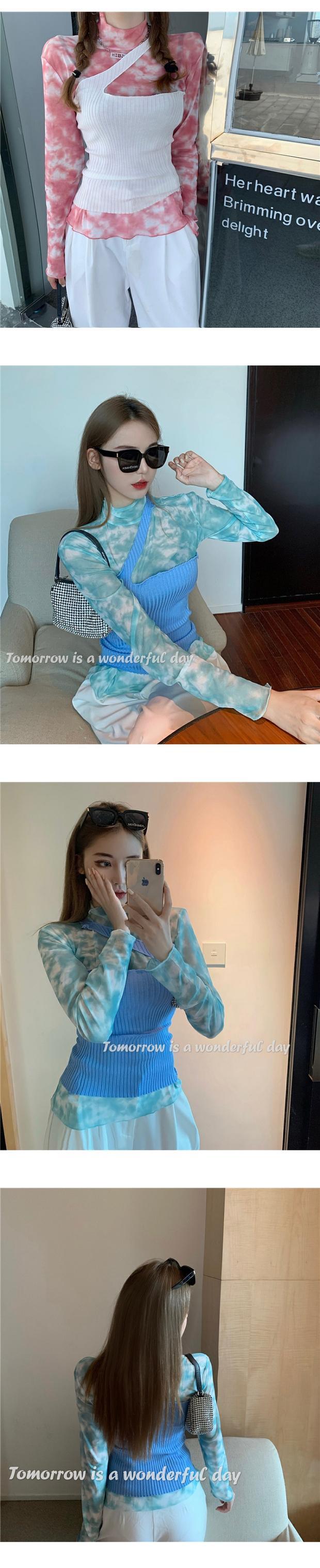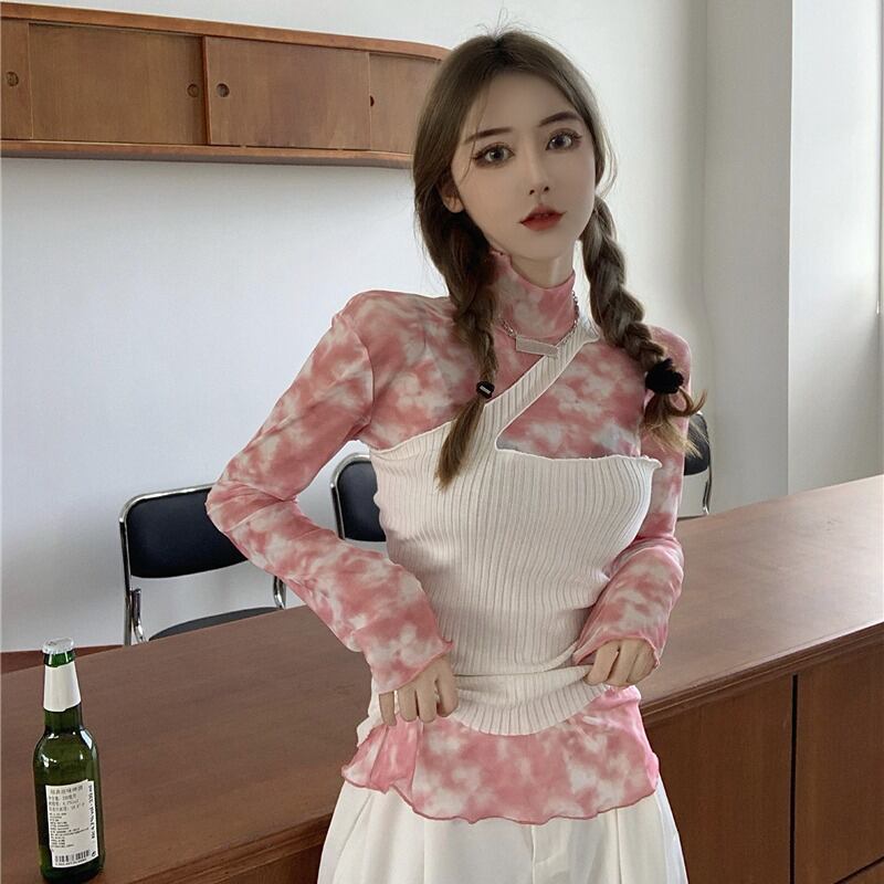 ピンクの絞り染めハイネック長袖Tシャツレディース秋のネットヤーンインナーボトミングシャツ2020新しいスリムトップイントレンド ブラックストロベリース11812393930