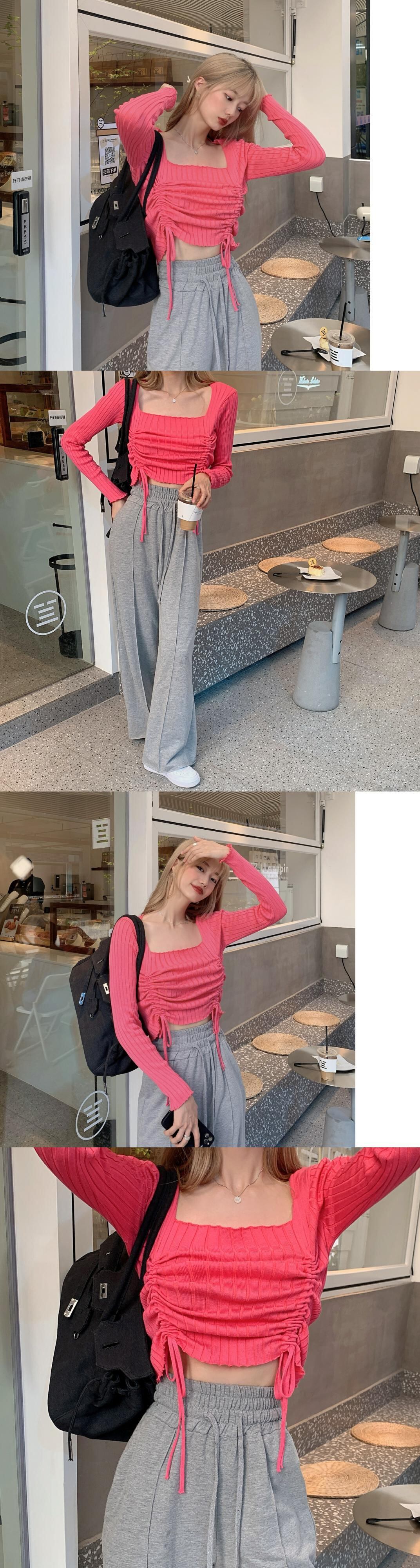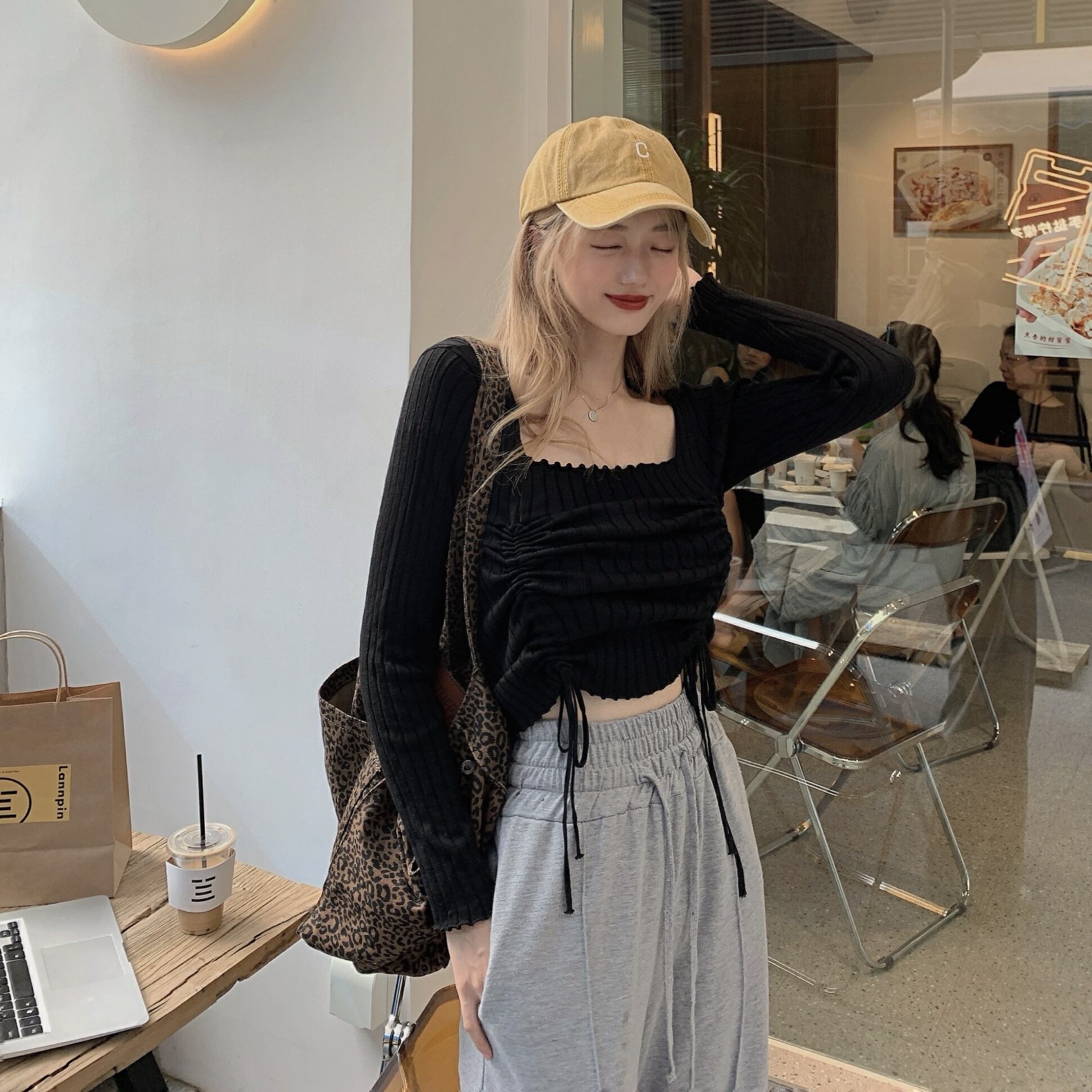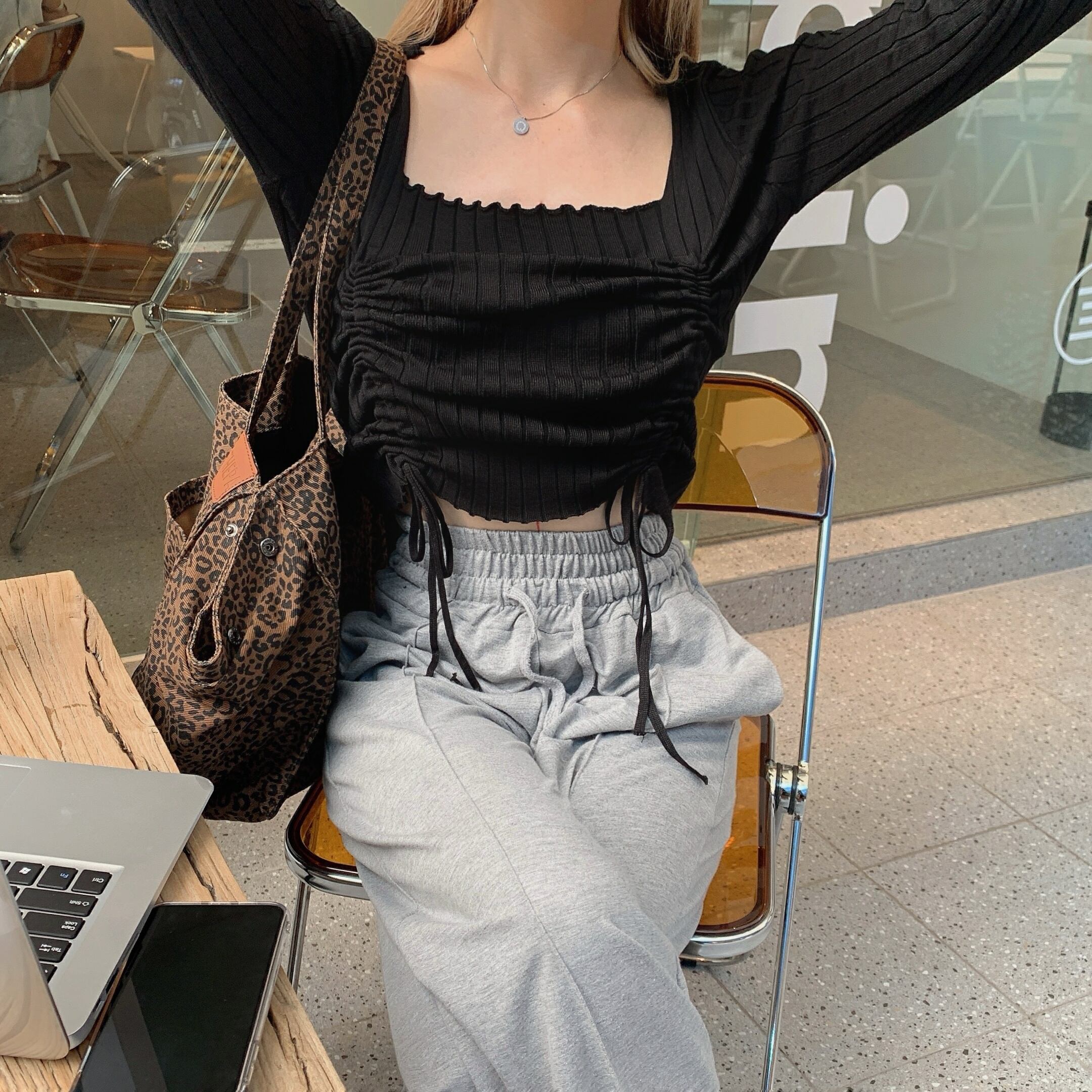 スクエアネックレース巾着タイトフィットホワイト長袖ニットトップレディース2020年秋新作インナーボトミングシャツ ブラックストロベリース81593369847