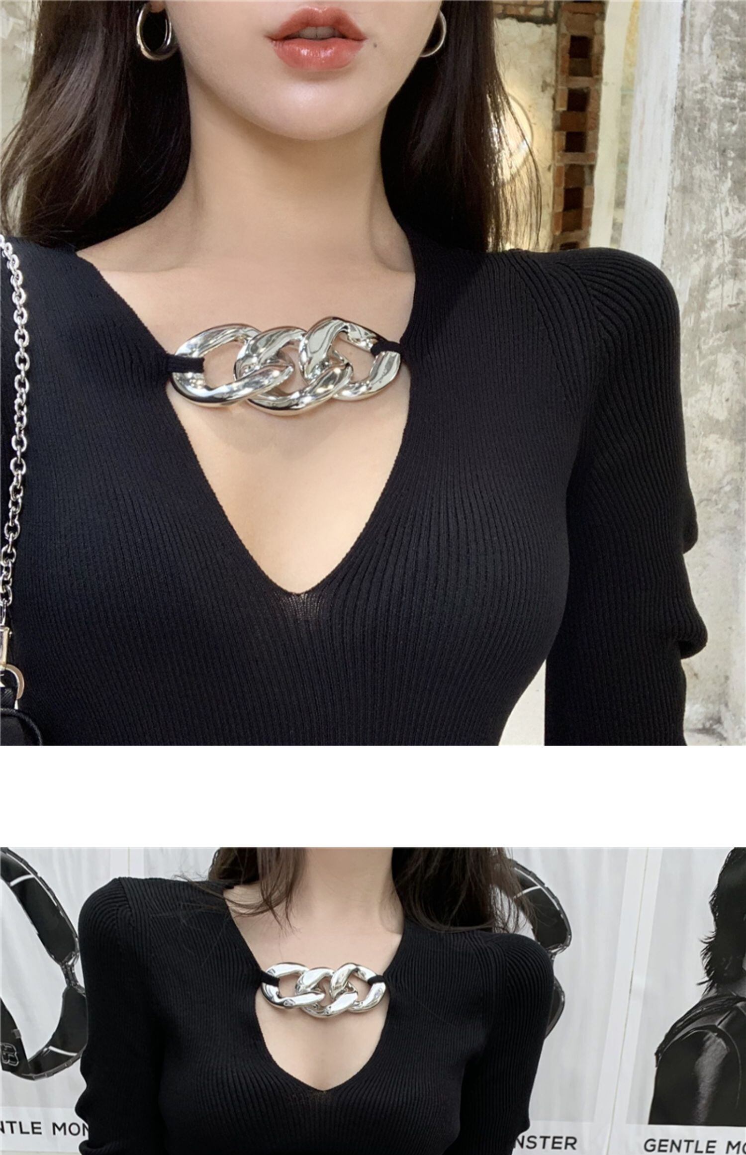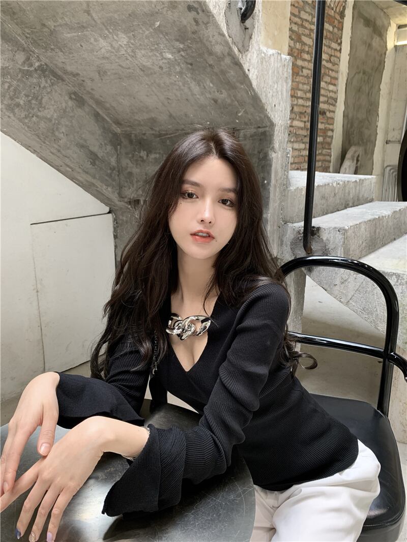 センスブラックニットTシャツレディース秋タイトフィット長袖Vネックボトミングシャツ2020新チェーントップ ブラックストロベリース13299738316