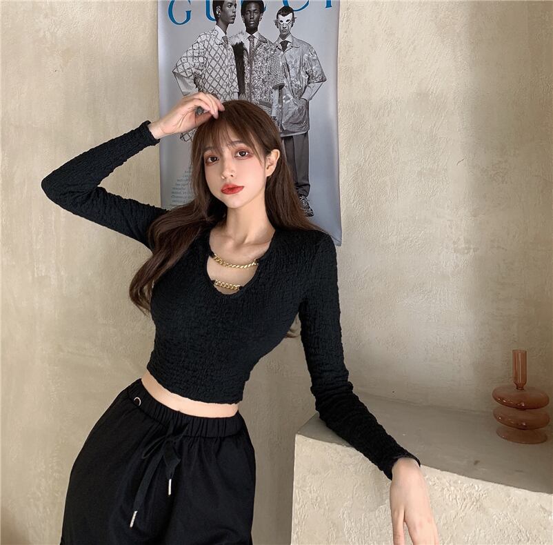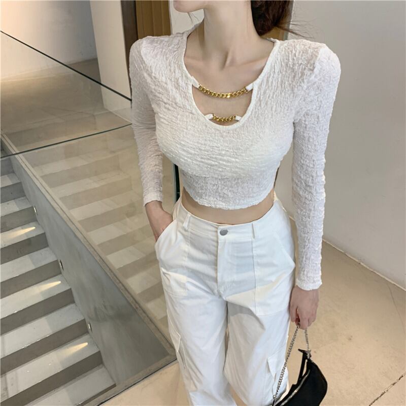 チェーンデザインセンスホワイトTシャツレディース秋タイトフィット長袖ボトミングシャツ2020新しいセクシーショートトップ ブラックストロベリース20443623130