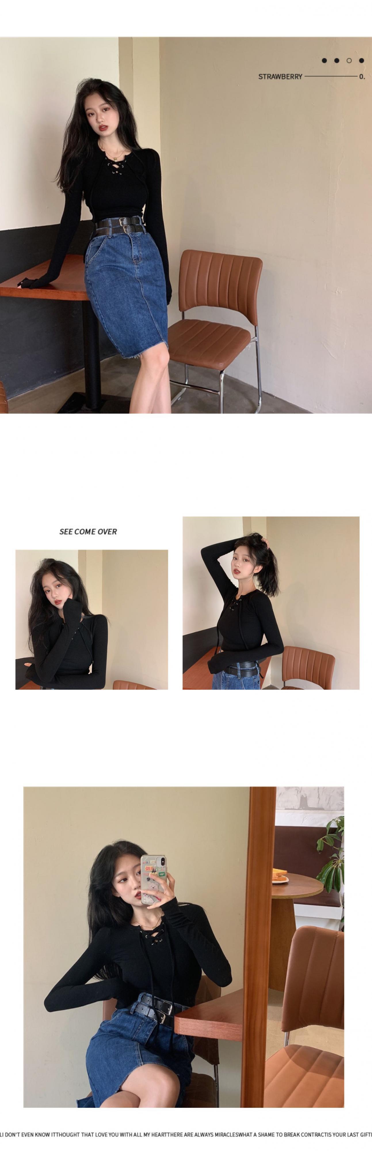 Vネックネクタイスリムショート長袖ニットTシャツレディース2020年秋新作ブラックインナーベースシャツトップス ブラックストロベリース93206874335