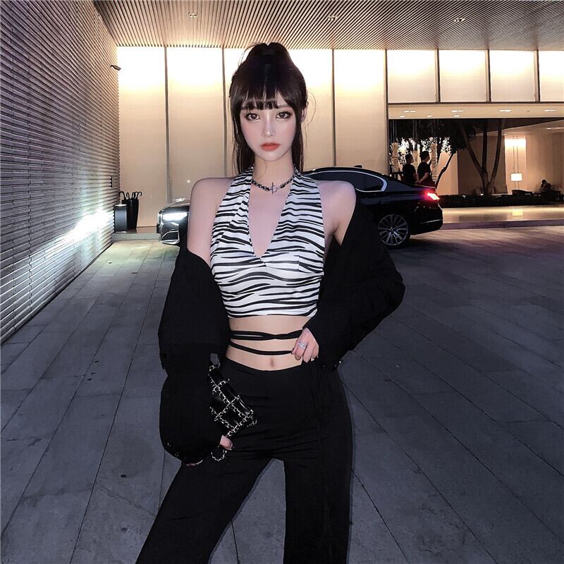 Vネックゼブラ柄ホルターネックビューティーバックスモールキャミソールレディースショートセクションボトミングとセクシータイトトップス着用 ブラックストロベリース93975018557