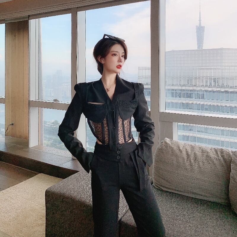 レースステッチスーツジャケット女性2020年秋新デザインセンスニッチスーツブラックショート気質トップ ブラックストロベリース48991920884