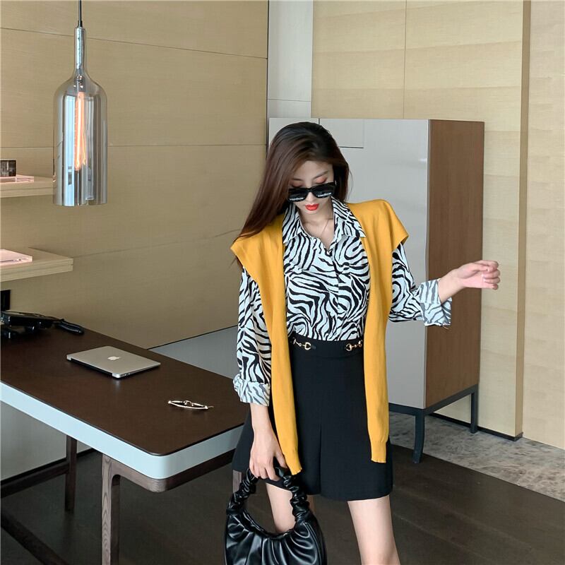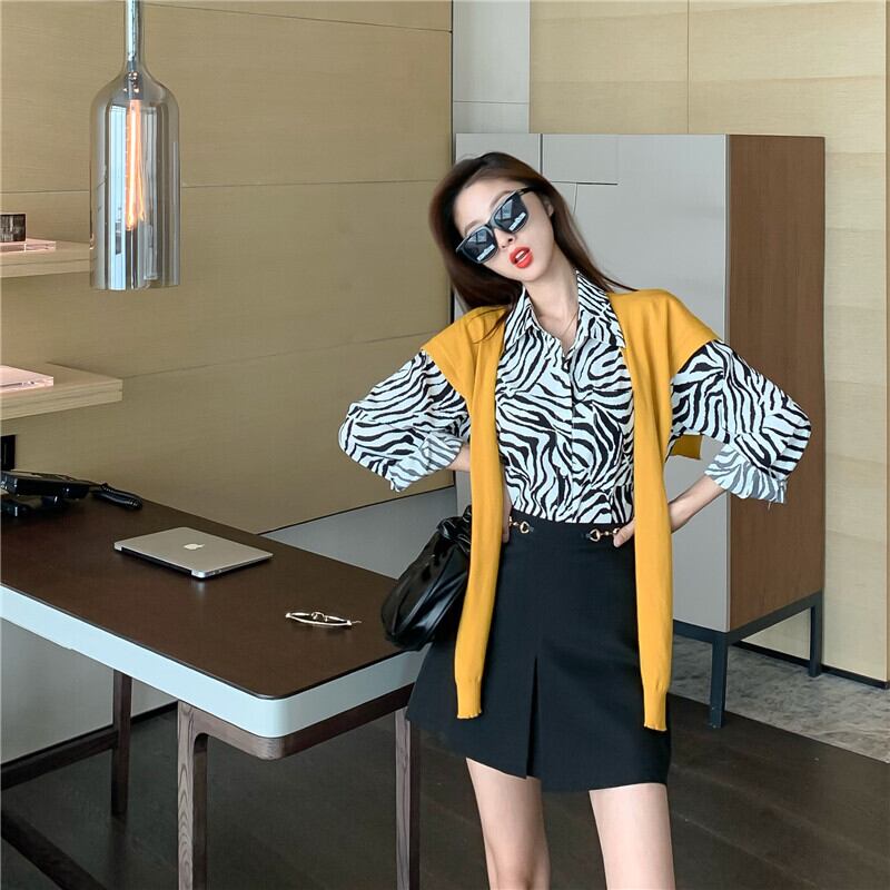 ゼブラ柄デザインニッチミドル丈長袖シャツトップレディース2020秋新作ルーズシャツ ブラックストロベリース58521863217