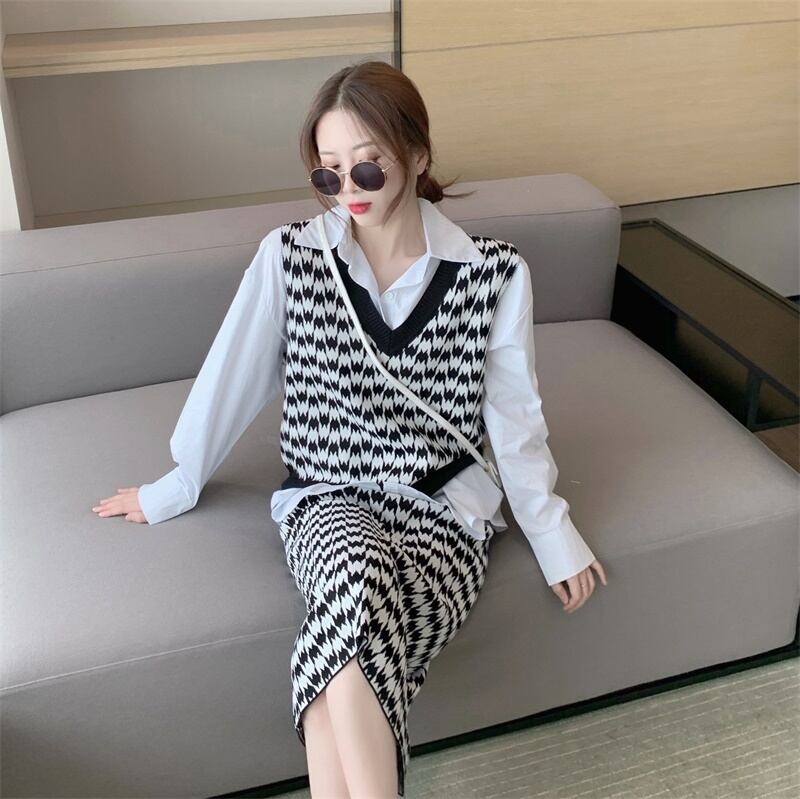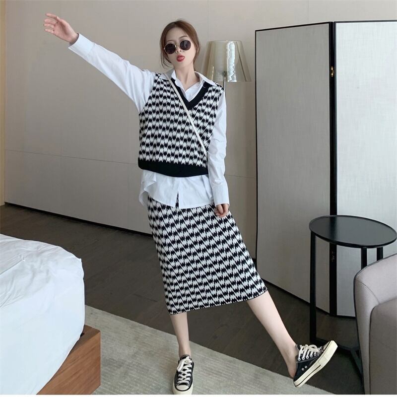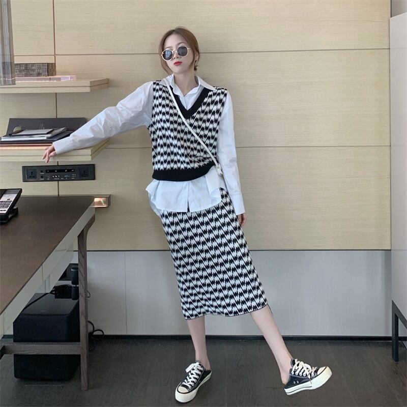 ライトマチュアスタイル長袖シャツスーツ女性2020年秋新作千鳥格子ニットベストスカートツーピーススーツ ブラックストロベリース44001732400