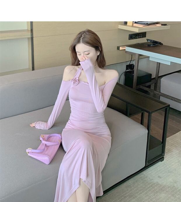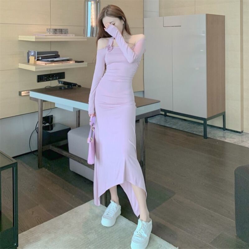 ピンクの長袖サスペンダードレス女性の初秋のセクシーなワンショルダータイトフィットヒップスカート2020新しいスカート ブラックストロベリース91939302676